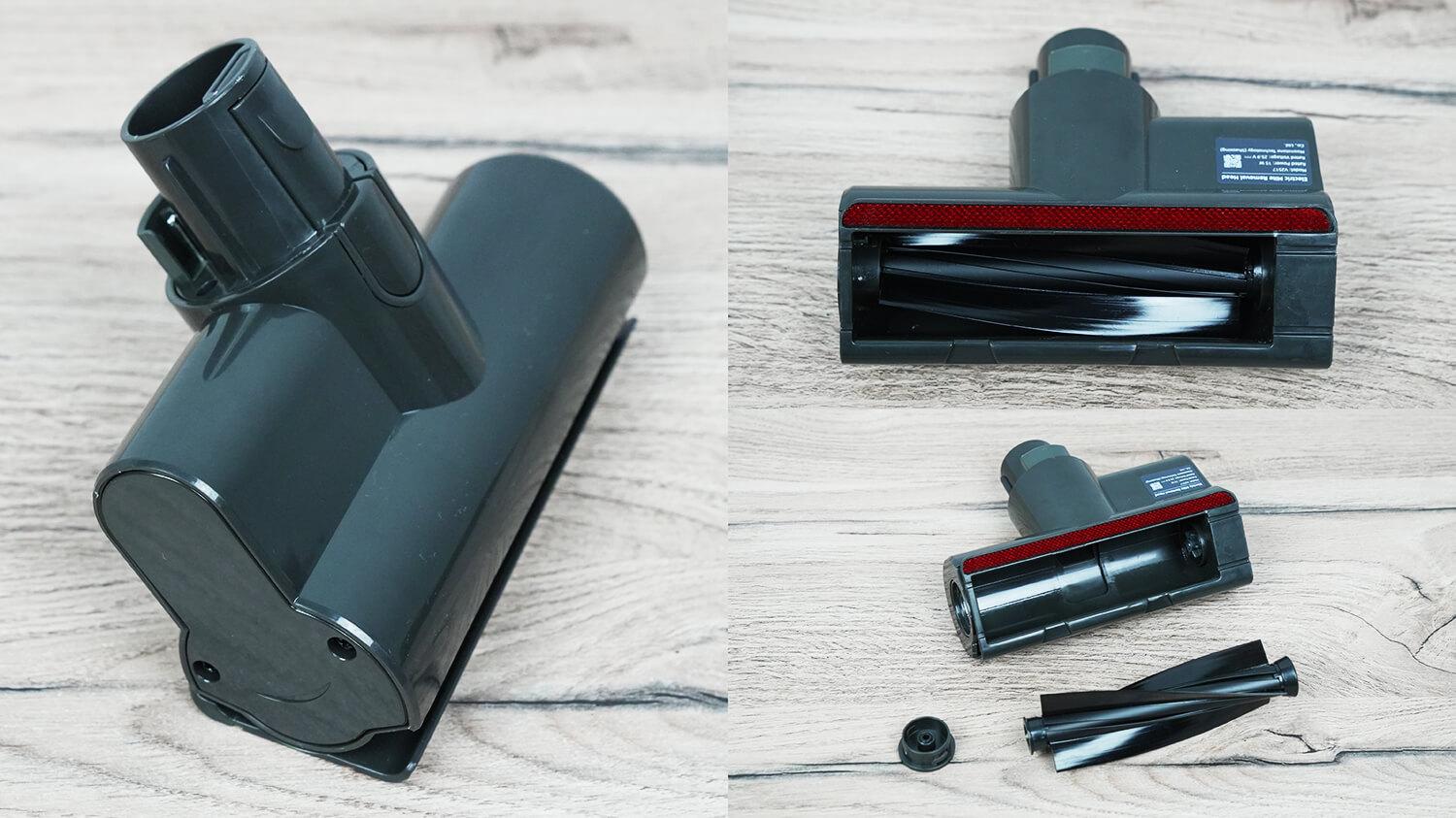 Pagrindinis grindų antgalis turi pasukamą jungtį ir priekinį valymo zonos apšvietimą. Permatomos angos leidžia praeiti didesnėms šiukšlėms. Volelį galima lengvai nuimti nuo antgalio be įrankių.