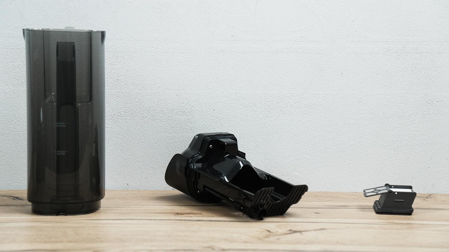 Nešvaraus vandens bakas yra gale. Jis taip pat didelis, talpinantis iki 700 ml panaudoto skysčio. Ant bako matomos dvi žymės: maksimalus vandens lygis vertikaliam ir horizontaliam veikimui. Viduje įrengta filtravimo sistema su HEPA filtru su tinkleliu ir šiurkščiu filtru skysčiui filtruoti. Vandens lygio jutikliai yra elektroniniai.