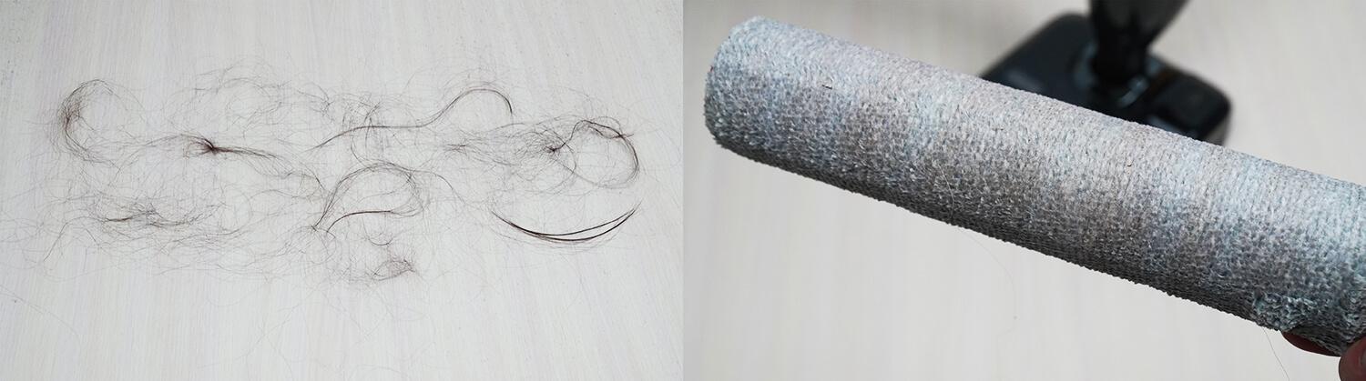 Taip pat išbandžiau, kaip šukos susidoroja su iššukuojamais plaukais ir kailiu nuo suktuko. Ant grindų patiesiau įvairaus ilgio plaukus, juos išsiurbiau ir suktukas buvo švarus. Plaukų apsaugos sistema veiksminga!