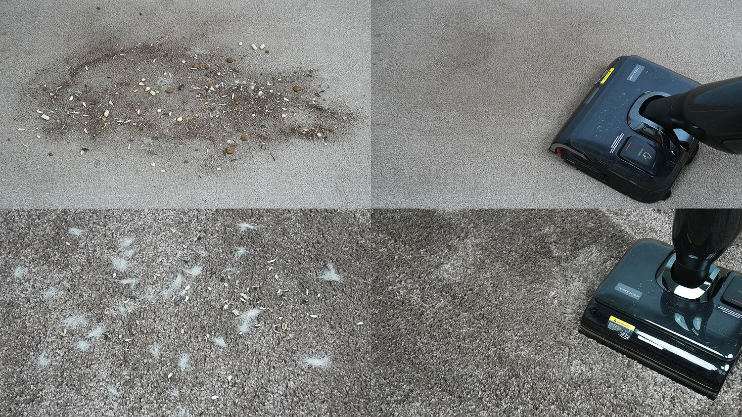 Be to, šis šlapio/sauso valymo dulkių siurblys gali būti naudojamas ir sausam valymui. Jis surinko visas šiukšles nuo laminuotų grindų. Jis be jokių problemų susidorojo net su didelėmis šiukšlėmis, pavyzdžiui, kačių kraiko granulėmis. Ir netgi sugebėjo surinkti visas šiukšles kampuose dėl automatinio grandiklio. Šis bandymas buvo sėkmingas!
