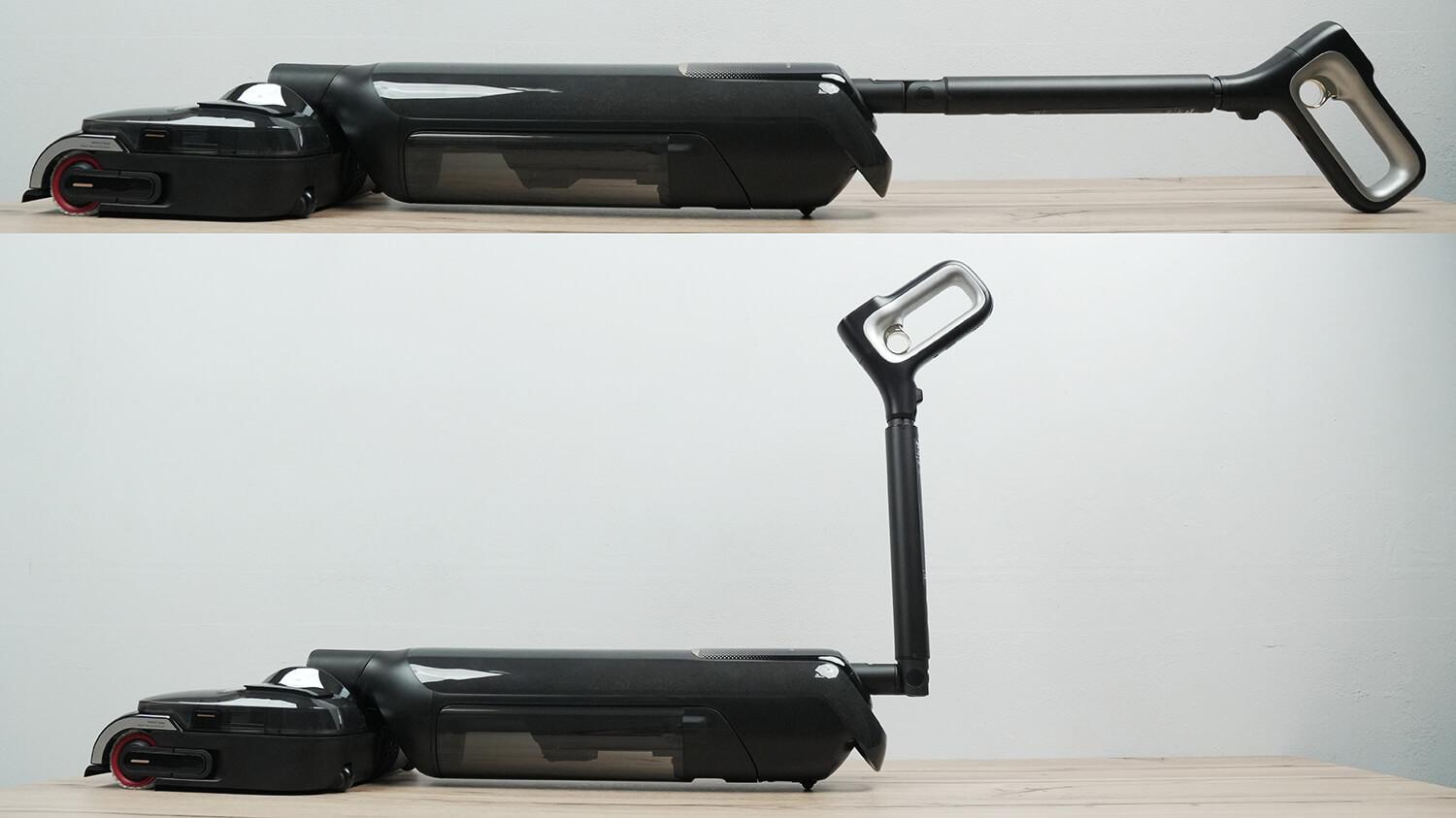 Ir štai vienas iš dulkių siurblio privalumų: paspaudus gaiduką, pagrindinė rankena sulinksta, todėl galite valyti po žemais baldais nesilenkdami. Arba bent jau mažiau lenkdamiesi atgal nei su įprastais šlapio/sauso valymo dulkių siurbliais.
