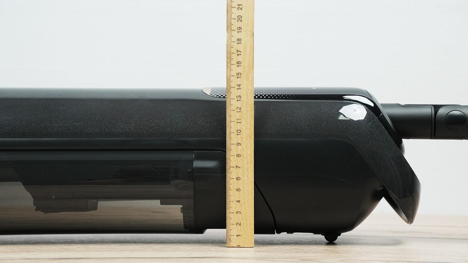Gulint dulkių siurblio aukštis yra 14 cm. Jis tilps į tokio dydžio tarpus.