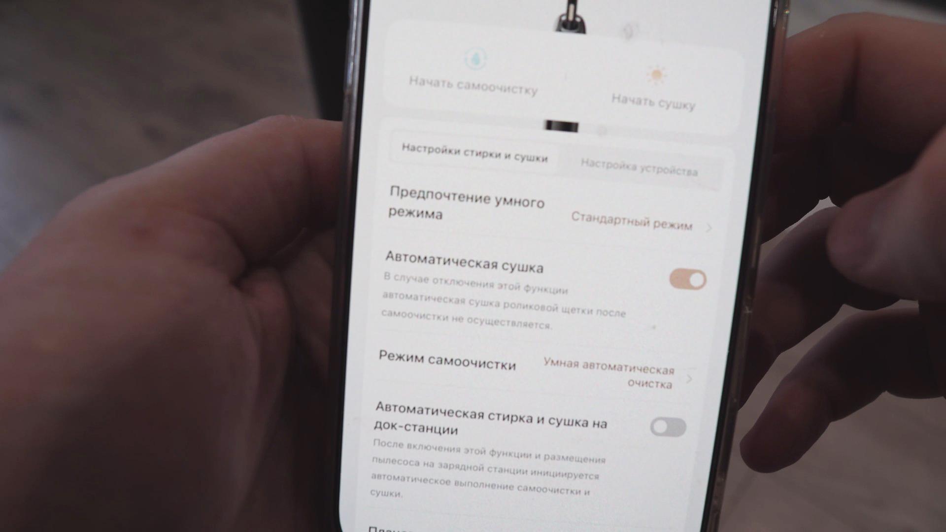 Čia galite lanksčiai pritaikyti tiek stoties, tiek dulkių siurblio nustatymus. Galite pasirinkti savaiminio valymo ir volelio džiovinimo režimą, vieną iš penkių dulkių siurblio veikimo režimų, reguliuoti ratų vairavimo lygį, nurodyti, kuriais režimais nuleisti automatinį valytuvą, ir peržiūrėti valymo statistiką bei eksploatacinių medžiagų būseną.