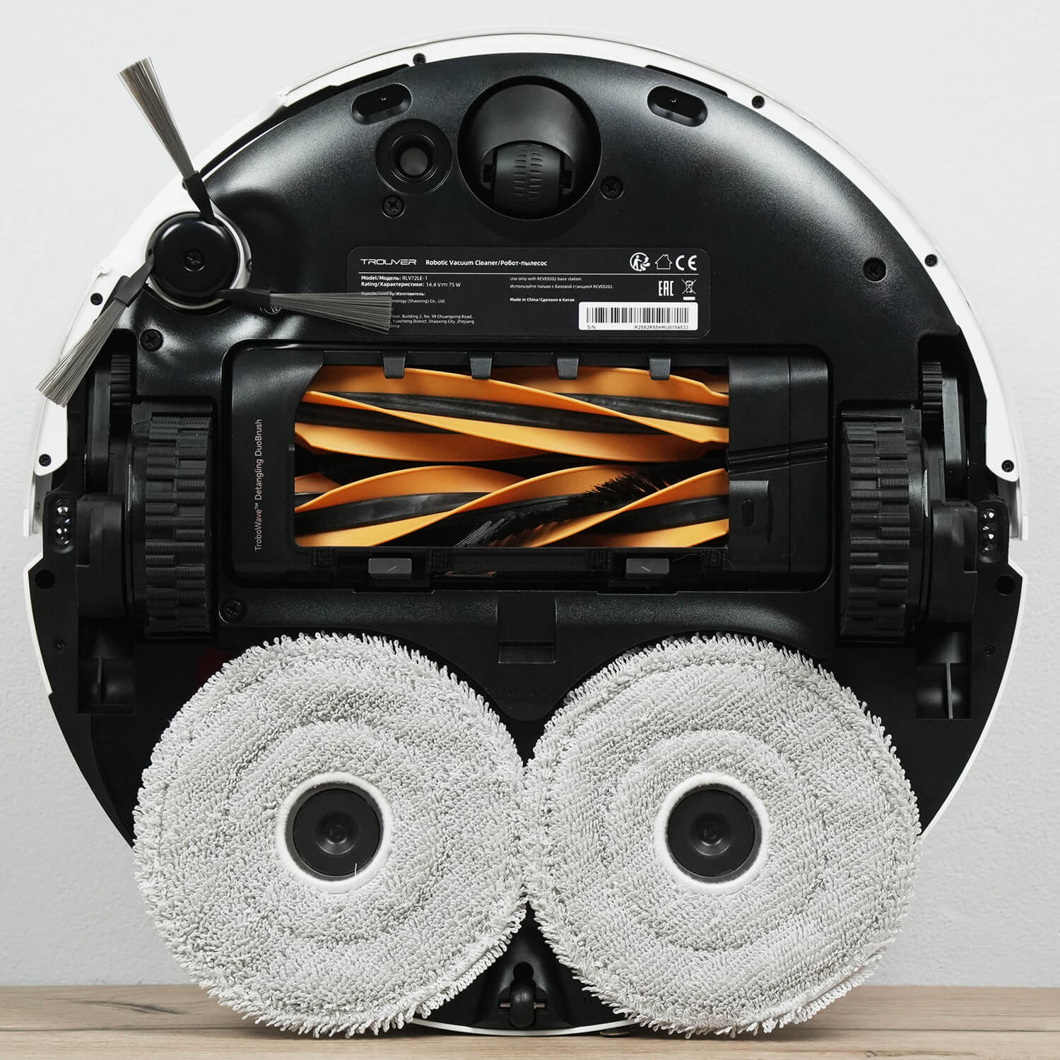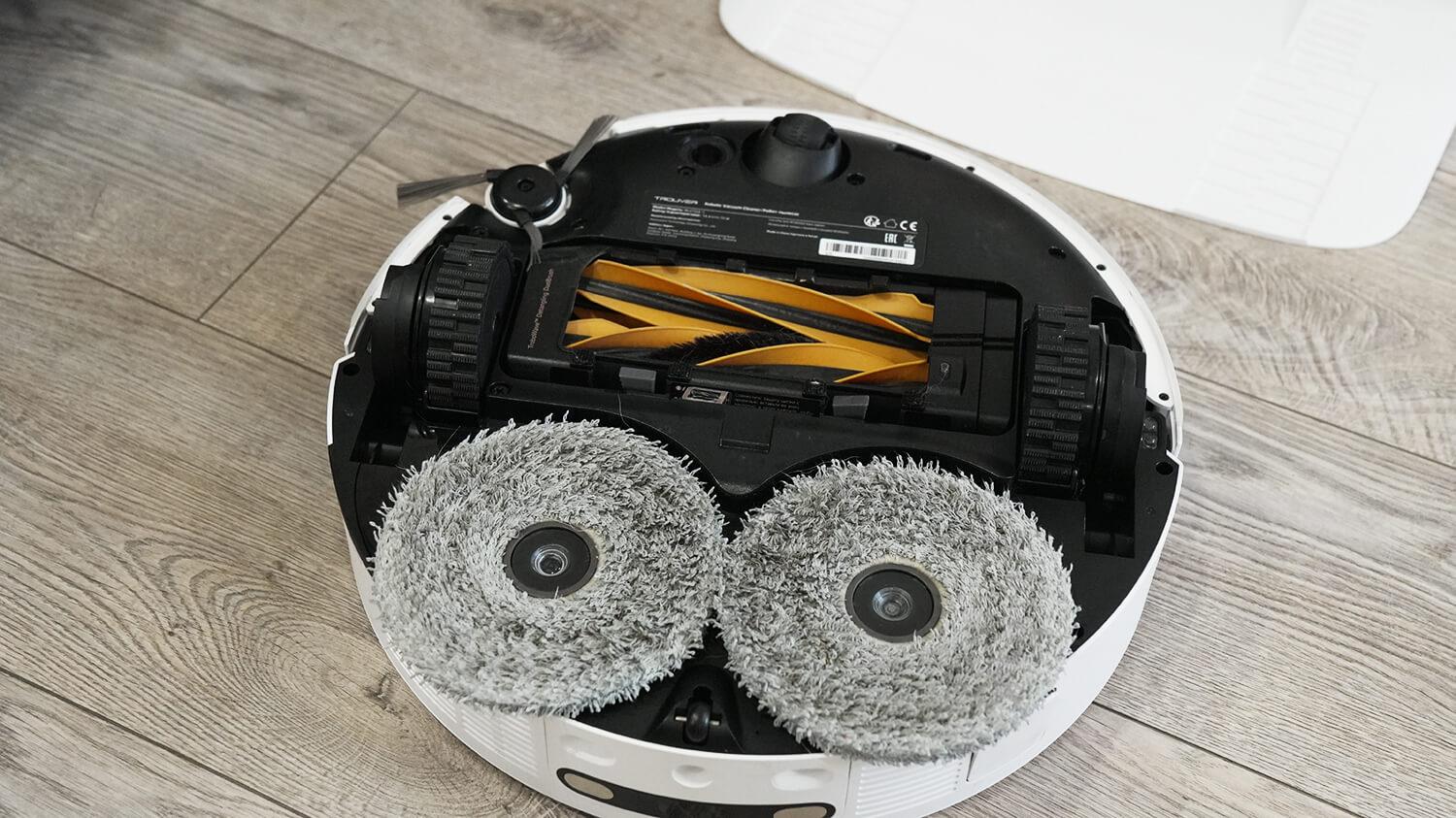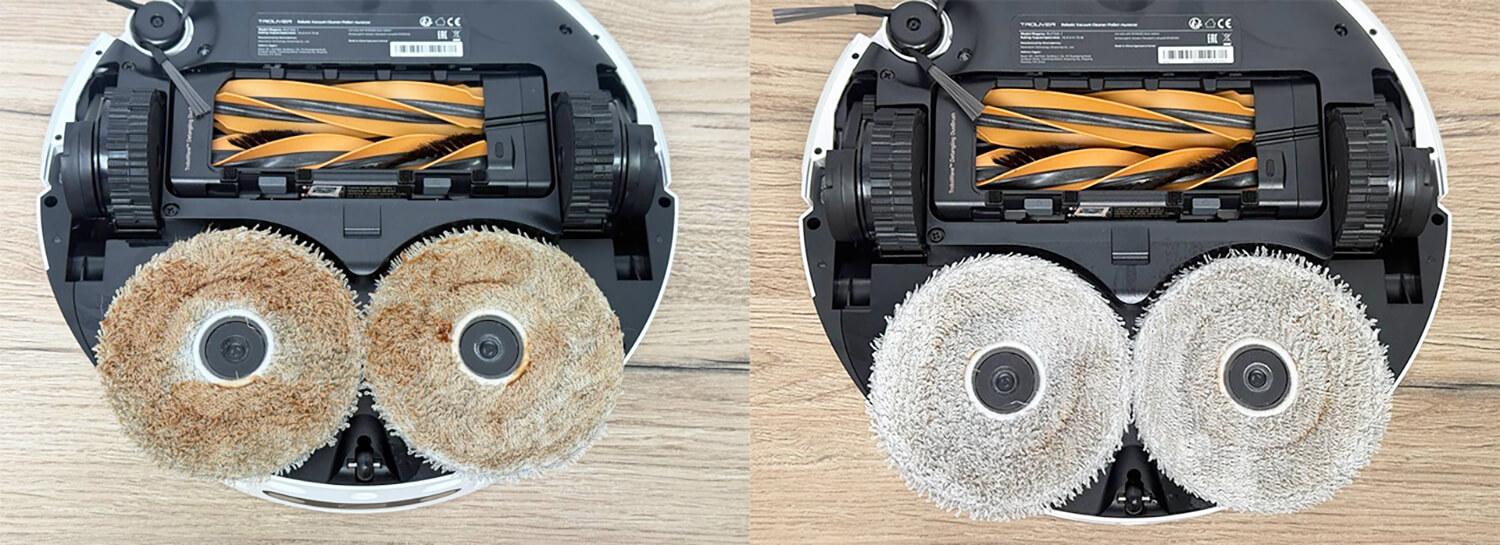 Šlapiam valymui robotas grindis valo dviem apvaliais, besisukančiais padais. Jie yra standartinio dizaino ir tvirtinami lipnia juosta „Velcro“.