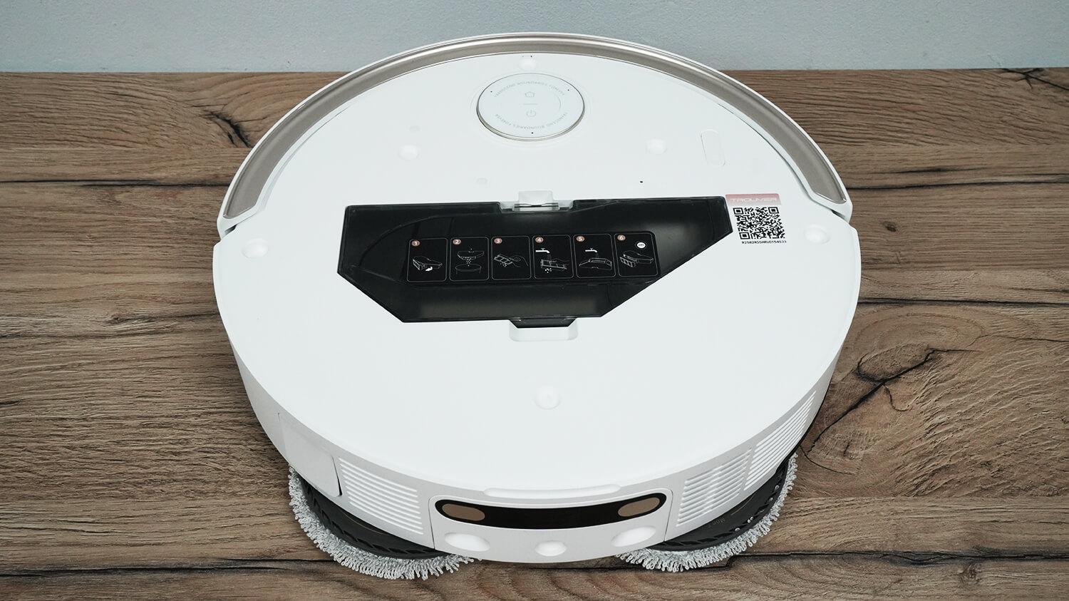 300 ml dulkių surinkimo konteineris yra po magnetiniu viršutiniu dangteliu. Šalia jo rasite QR kodą, skirtą robotui prijungti prie „Wi-Fi“ tinklo.
