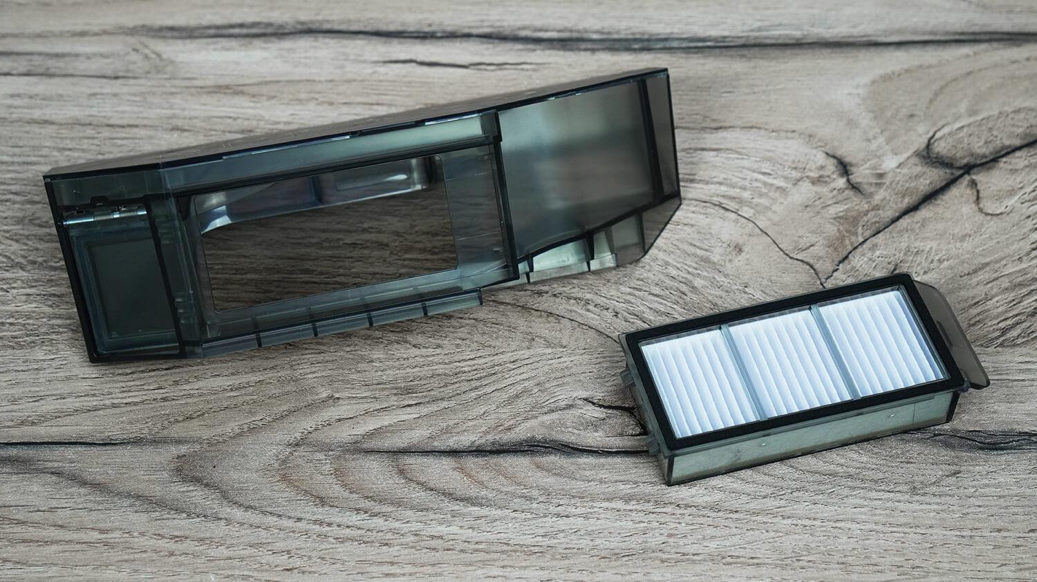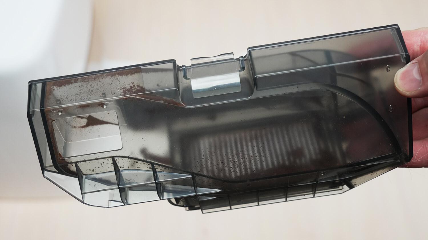 Iškart po „nešvarumų testų“ patikrinau roboto dulkių siurblio savaiminio valymo našumą. Grąžinau jį į stotelę ir paleidau savaiminio valymo ciklą. Rezultatai buvo geri, bet indas nebuvo idealiai švarus. Taip pat matėme, kaip užsikimšęs HEPA filtras. Jam tikrai praverstų tam tikra išankstinio valymo apsauga, pavyzdžiui, tinklelis.