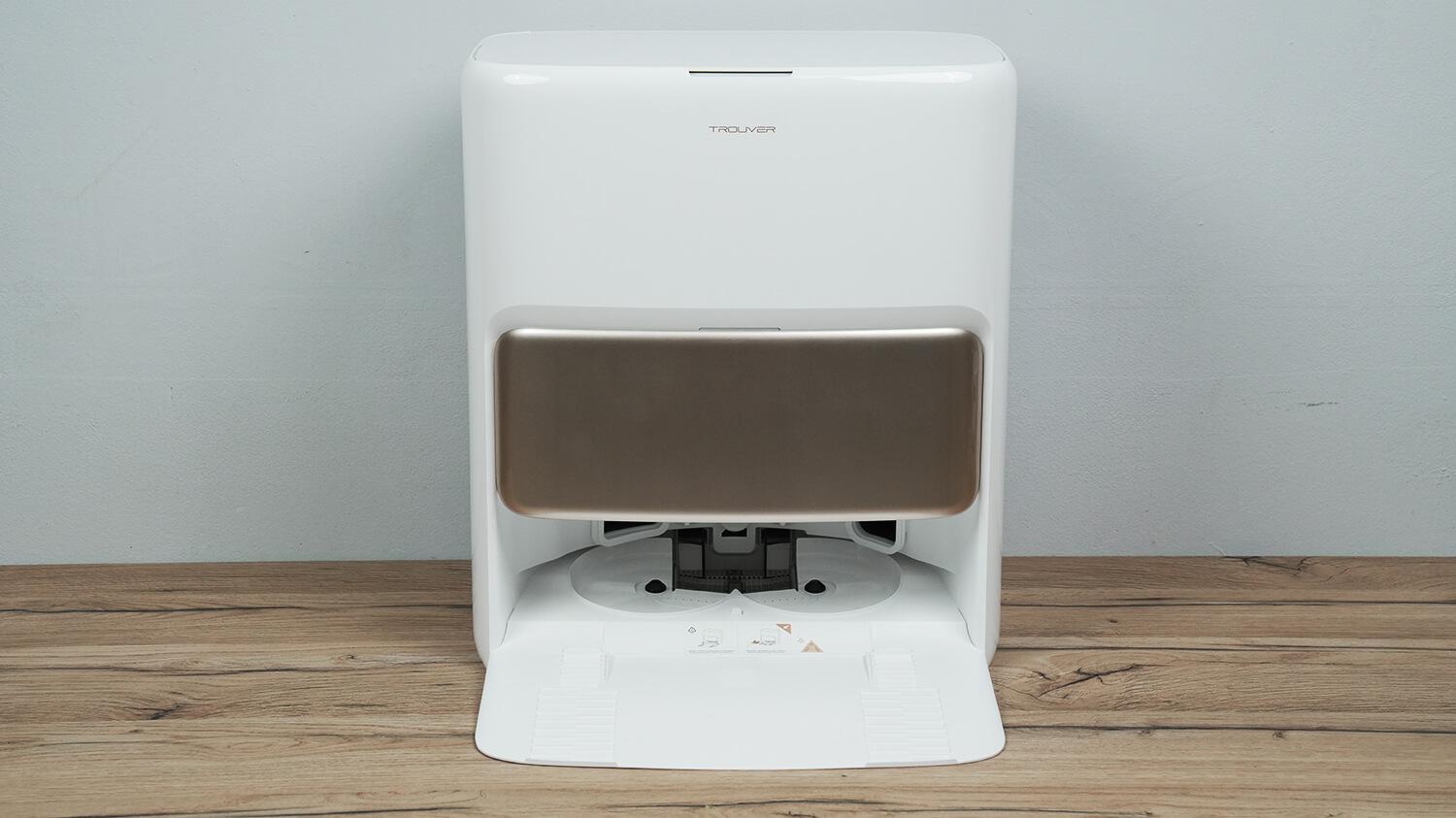 Dabar, kai aptarėme robotą, laikas stotelei. Čia „Trouver V50 Ultra Complete“ ne tik įsikrauna: jis pats išvalo dulkių surinktuvą, išplauna šluostes karštu vandeniu, automatiškai įmaišydamas ploviklio, išdžiovina šluostes šiltu oru ir išdžiovina dulkių surinktuvą bei dulkių maišelį. Be to, jame yra UV sterilizavimo funkcija, skirta maišeliui ir šluosčių plovimo zonai. Vienintelė šios stotelės problema yra ta, kad jos negalima prijungti prie kanalizacijos ar vandens tiekimo, ir tai yra pirmoji rimta roboto kritika. Dabar atidžiau panagrinėkime kiekvieną stotelės komponentą.