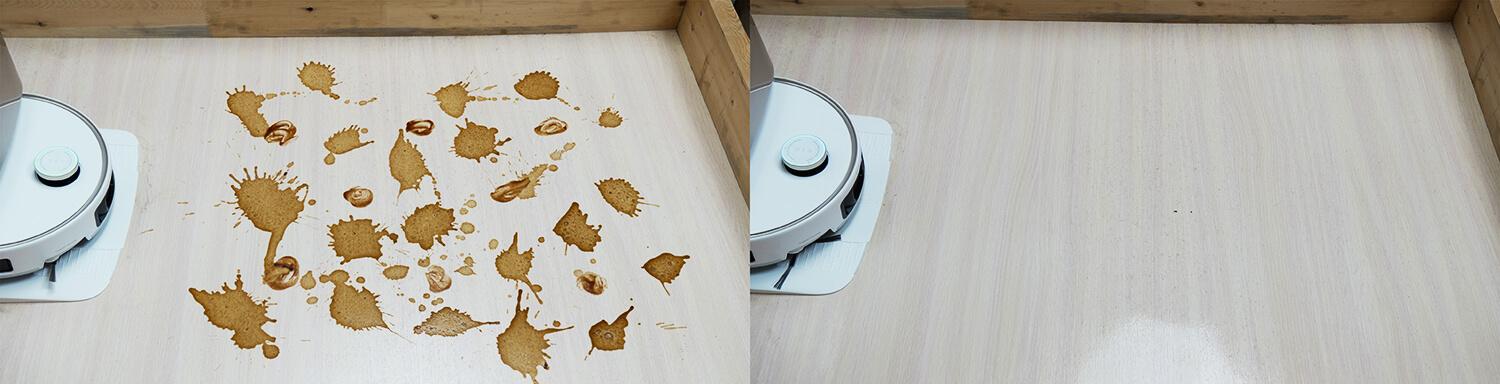Išbandžiau dėmių aptikimą: iš pirmo karto robotas nepastebėjo išdžiūvusio kečupo. Antro kartojimo metu jis aptiko dėmę, išjungė siurbimą ir kryžminiu būdu išvalė dėmę grindų valymo režimu. Tada jis grįžo į stotelę, išplovė valymo pagalvėles ir tęsė įprastą valymą. Tačiau nebuvo atliktas tolesnis patikrinimas, ar dėmė vis dar yra, ir dalis dėmės liko. Išvada: funkcija egzistuoja, bet ji vis dar yra apytikslė ir ją reikia patobulinti.