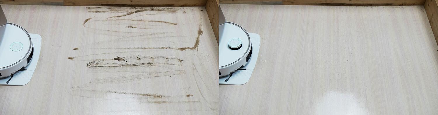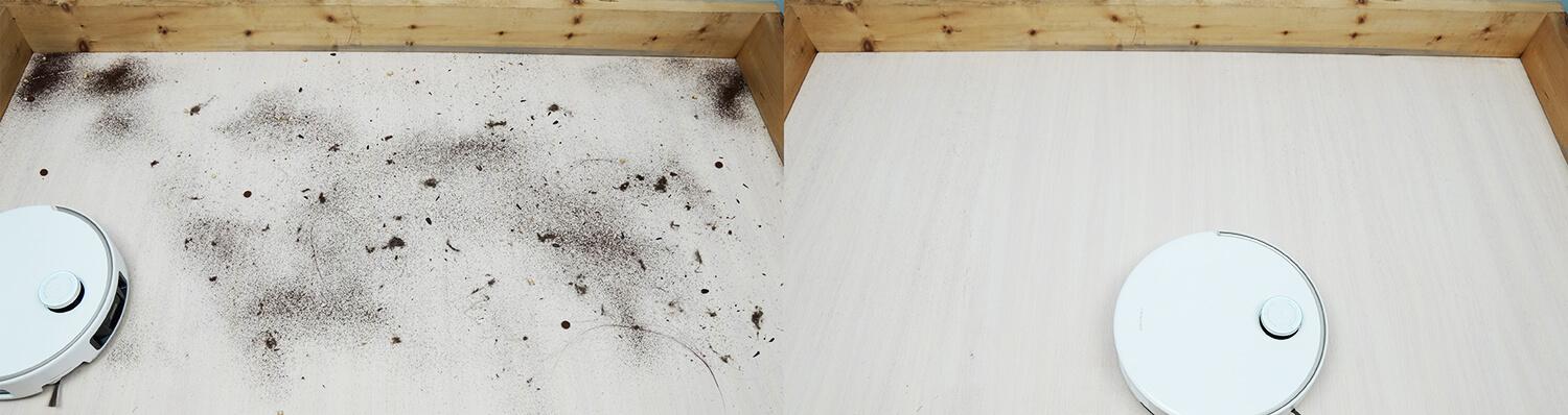 Laminuotų grindų valymo našumas puikus: robotas surinko nuo grindų visas šiukšles, įskaitant dideles, sunkias kačių kraiko granules, kurios dažnai įstringa turbo šepečiuose. Kampų valymas ypač įspūdingas – ištraukiamas šoninis šepetys surenka visas šiukšles. Išoriniai kampai taip pat valomi, nors kraštuose, arčiau kampų, lieka mažų aklųjų zonų.