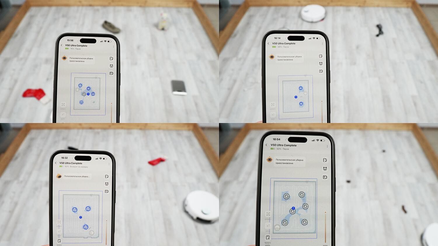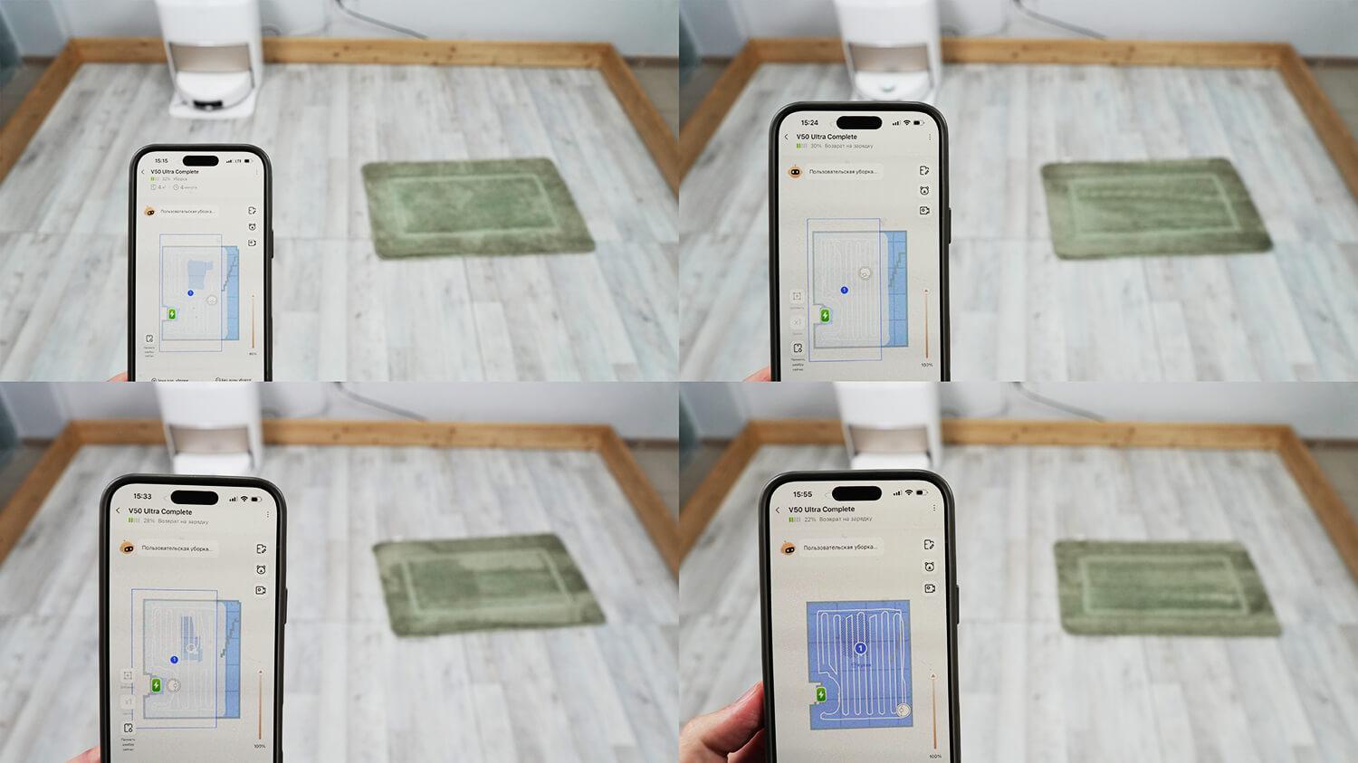 Galiausiai, įdomiausias yra ketvirtasis režimas. Robotas dulkių siurblys pirmiausia atlieka sausą ir šlapią kietų grindų valymą, tada grįžta į bazę, automatiškai atkabina valymo pagalvėles ir, išsiurbęs kilimus be pagalvėlių, grįžta prie valymo proceso. Tai ypač naudinga valant kilimus su dideliu ir vidutiniu plauku, nes prireikus visiškai pašalina bet kokį pagalvėlės sąlytį su kilimu.
