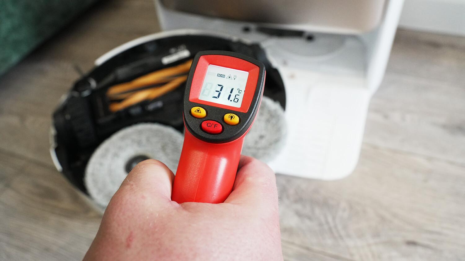 Taip pat patikrinau dulkių konteinerio džiovinimo temperatūrą. Roboto viduje esančio konteinerio jutiklis rodė 33,5 laipsnio Celsijaus.