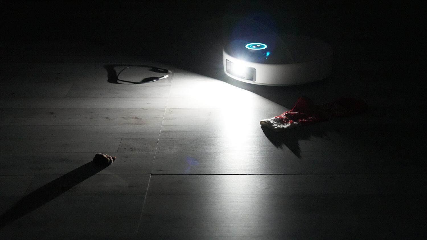 Visiškoje tamsoje objektų atpažinimo sistema taip pat gali veikti dėl foninio apšvietimo, tačiau kamera vis tiek apakinta. Robotas sugebėjo išvengti tik dviejų iš šešių namų apyvokos daiktų – žaislo ir bato – ir jų neatpažino. Likusius jis tiesiog pervažiavo. Iš keturių išbandytų laidų jis stebėtinai tiksliai išvengė visų keturių, bet atpažino tris. Iš trijų išbandytų kojinių jis atpažino ir išvengė visų trijų. Kalbant apie augintinių staigmenos modeliavimą, robotas atpažino ir išvengė penkių iš šešių spąstų ir pervažiavo per vienerius.