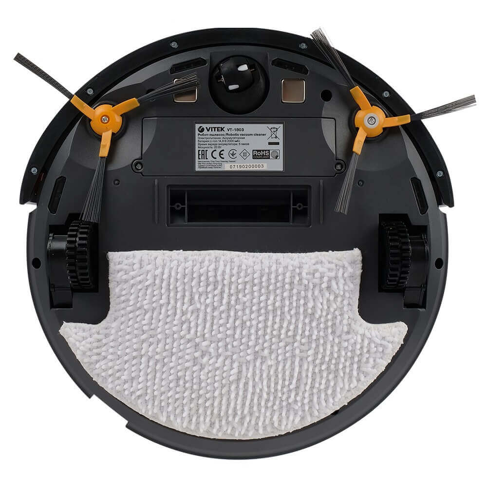 VITEK VT-1803 gale yra du varomieji ratai šonuose, pasukamas volelis, įkrovimo kontaktai, akumuliatoriaus skyrius, keturi apsaugos nuo kritimo jutikliai, šoninių šepečių pora ir siurbimo antgalis.