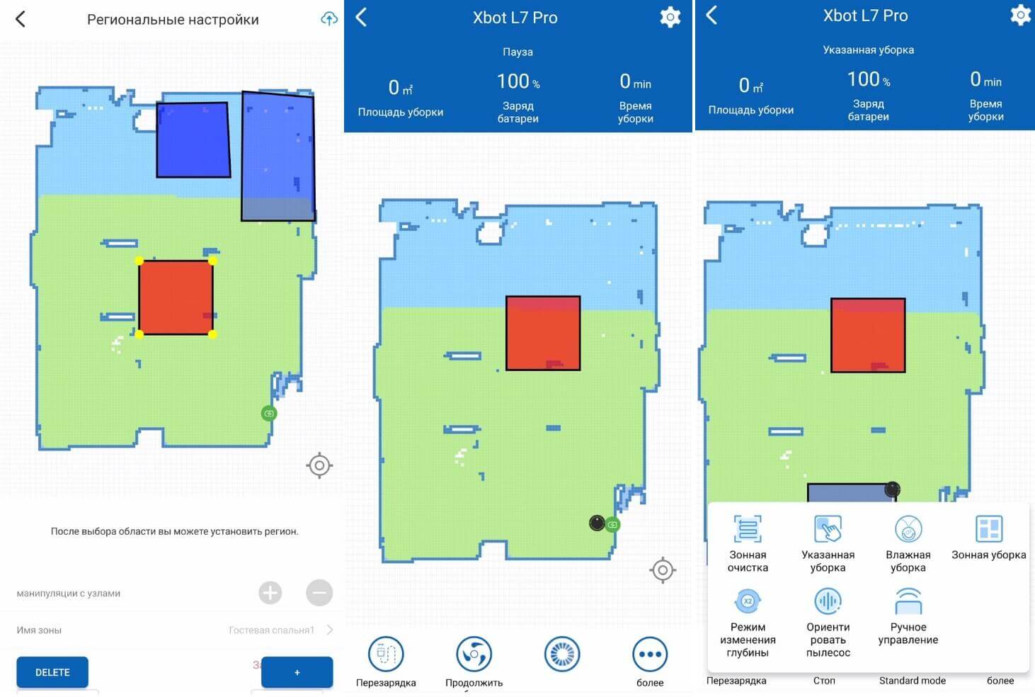 Dabar panagrinėkime žemėlapio galimybes. Galite suskirstyti kambarius į zonas arba, atvirkščiai, sujungti kelis kambarius į vieną. Žemėlapyje galite nustatyti valymo zonas, draudžiamų zonų, į kurias robotas neįeis, ir giluminio valymo zonas, kurių metu robotas du kartus praeina nurodytą zoną. Beje, „Xbot L7 Pro“ gali savo atmintyje saugoti kelis valymo žemėlapius, o tai yra privalumas.