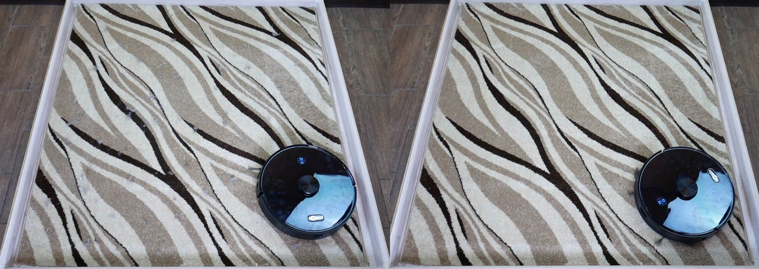 Taip pat išbarstėme kailį ir plaukus ant kilimo. Net ant kilimo „Xbot L7 Pro“ veikė gerai. Testas išlaikė!