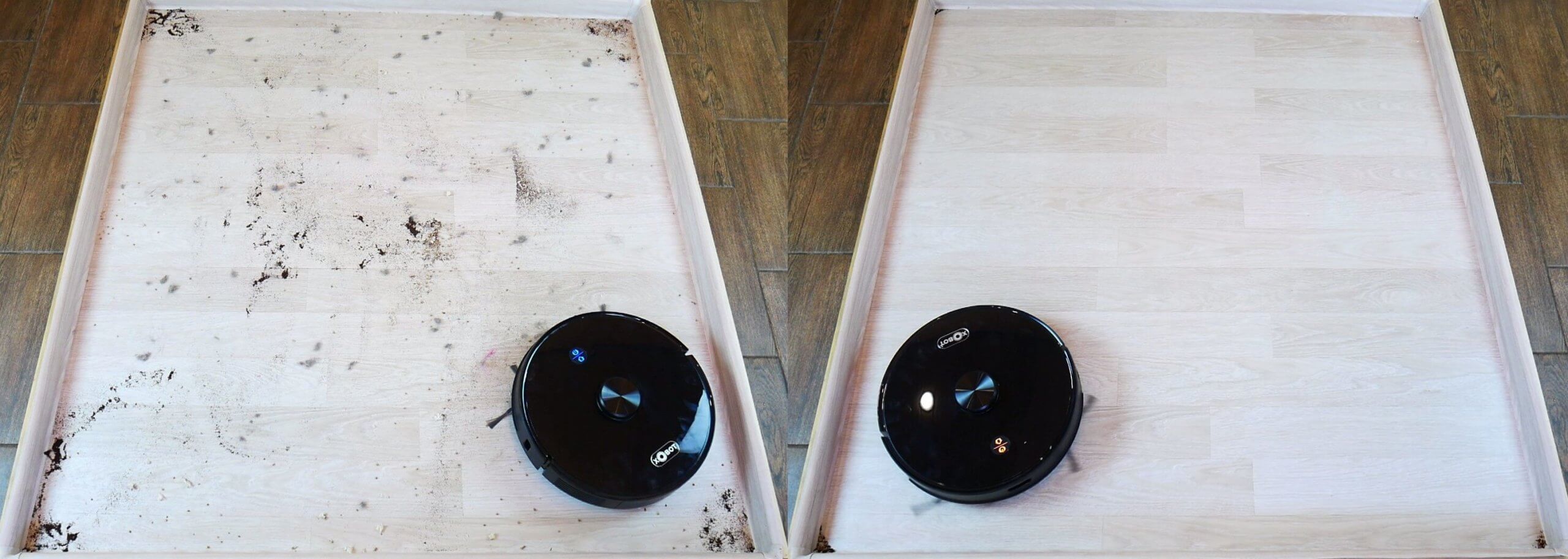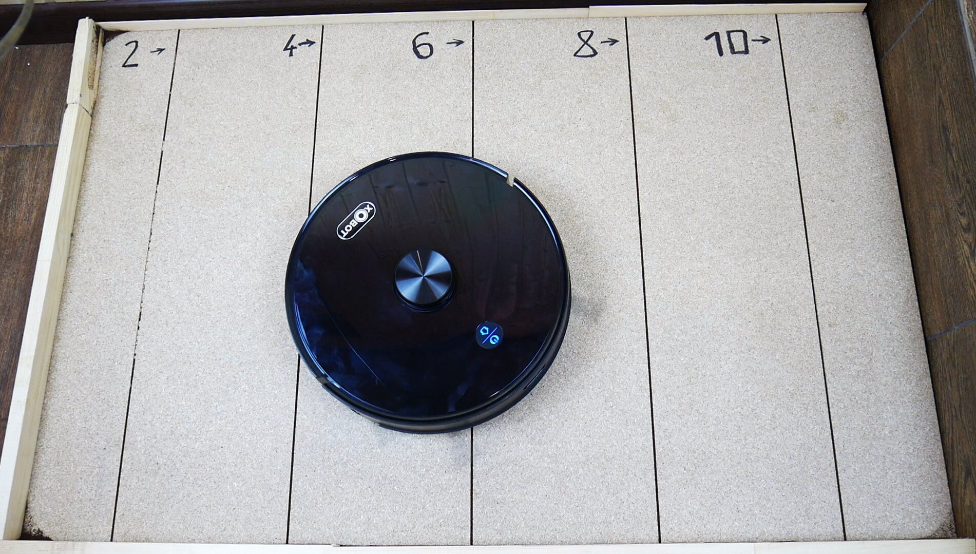 Ekranas buvo nusėtas dulkėmis, plaukais, dribsniais ir malta kava, imituojant dulkes kampuose. Ir štai „Xbot L7 Pro“ maloniai nustebino! Jam pavyko surinkti visas šiukšles, netgi iššluoti jas iš dviejų kampų. Apvaliam robotiniam dulkių siurbliui sauso valymo našumas yra labai aukštas.