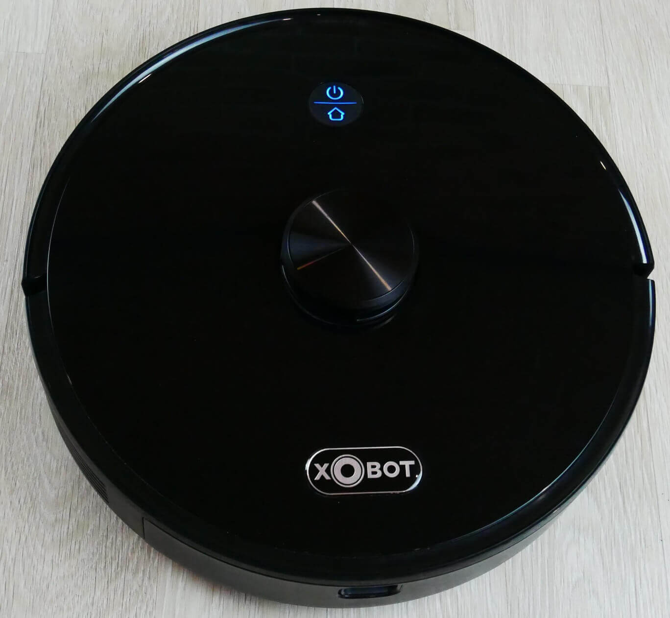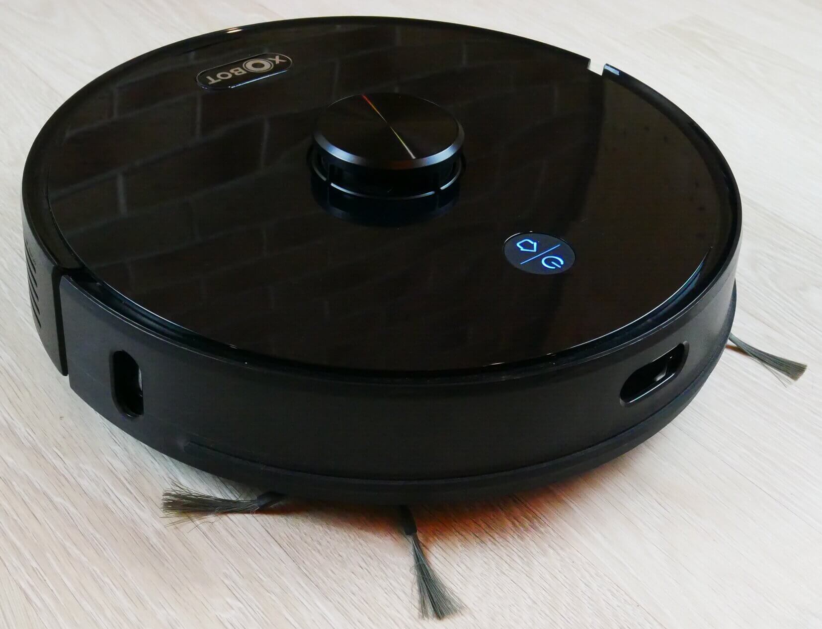 Pažvelkime į „Xbot L7 Pro“ dizainą. Jis apvalus ir blizgios juodos spalvos. Kliūčių aptikimo jutiklis sumontuotas priekiniame bamperyje, o sieninis jutiklis – dešinėje.