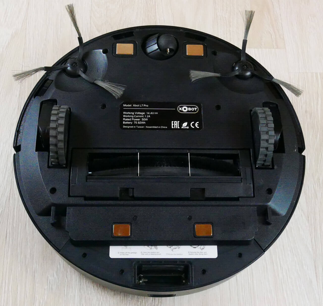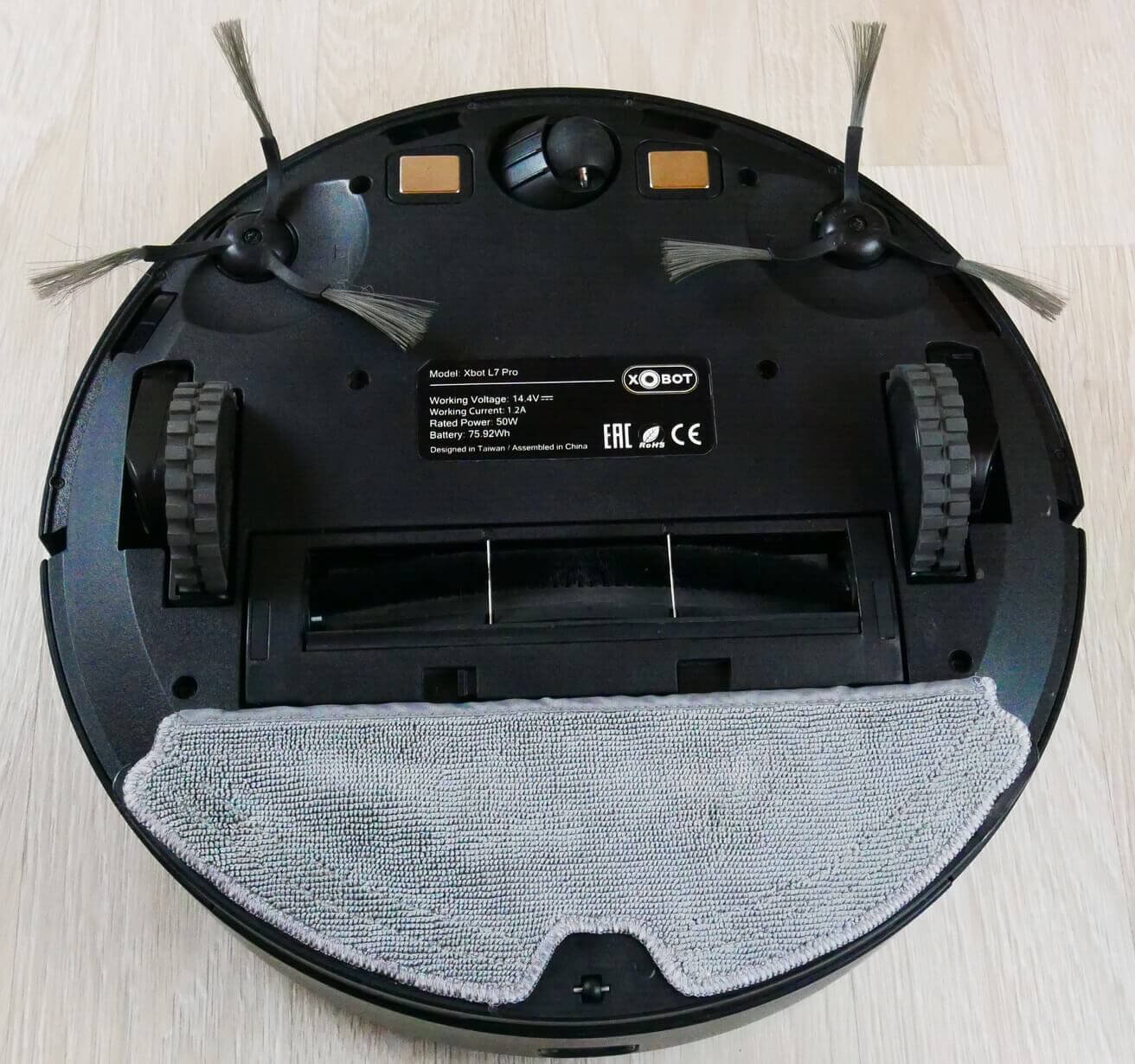 Pažvelkime į roboto dulkių siurblio apačią. Jame yra du šoniniai šepečiai ir centrinis turbo šepetys su šereliais ir žiedlapiais. Šereliai tankūs, o šepetys nuimamas. Kaip matote, apačioje yra dvi poros įkrovimo kontaktų.