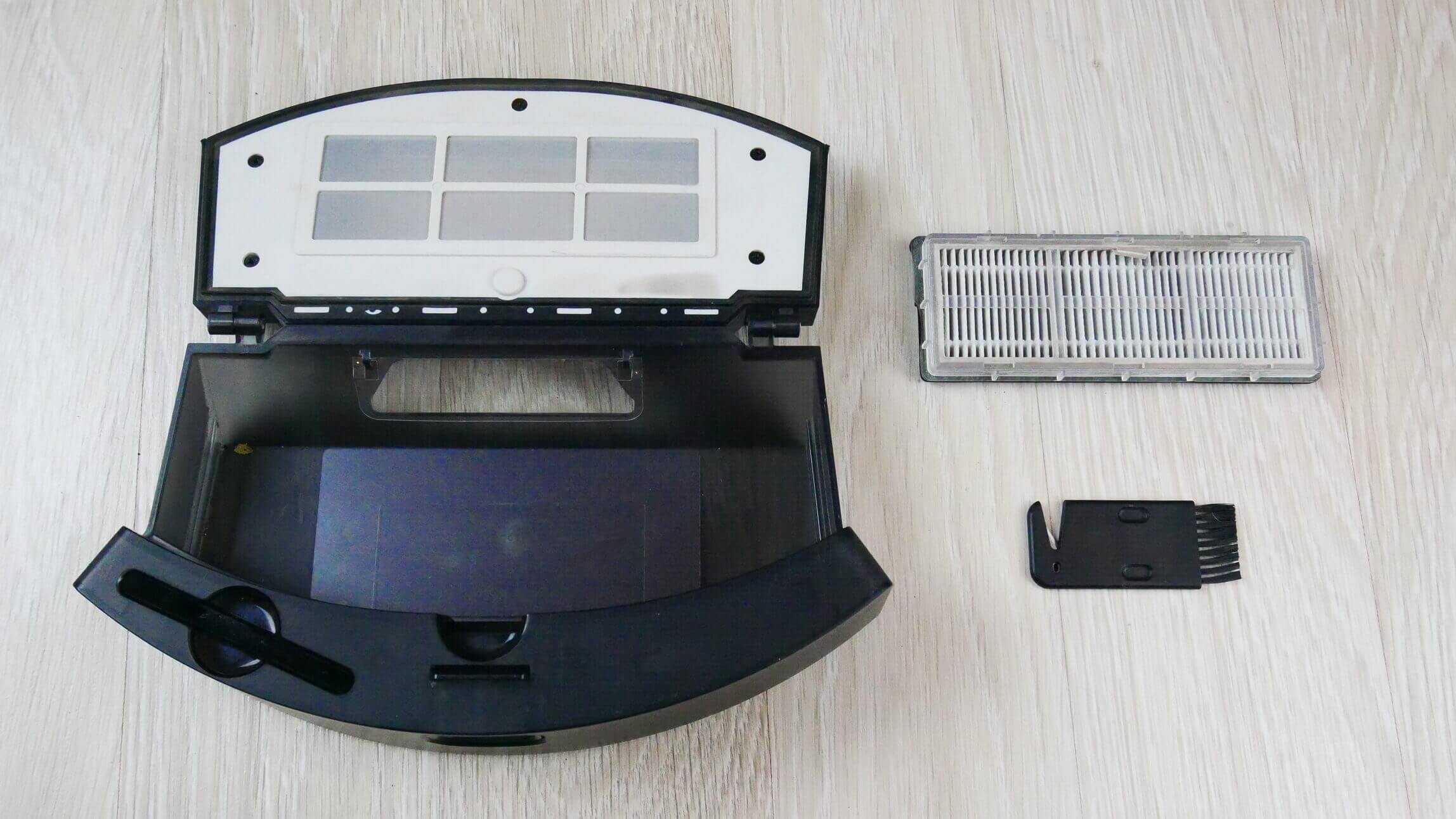 Dulkių surinktuvas nuimamas iš galo. Jame yra konteinerio valymo įrankis ir centrinis šepetys. Apačioje yra speciali anga, skirta prijungti prie pagrindo. Per šią angą nešvarumai įsiurbiami į maišelį pagrinde. Filtravimo sistemoje naudojamas tinklelis ir HEPA filtras. Gamintojo teigimu, dulkių surinktuvo talpa yra 600 ml.