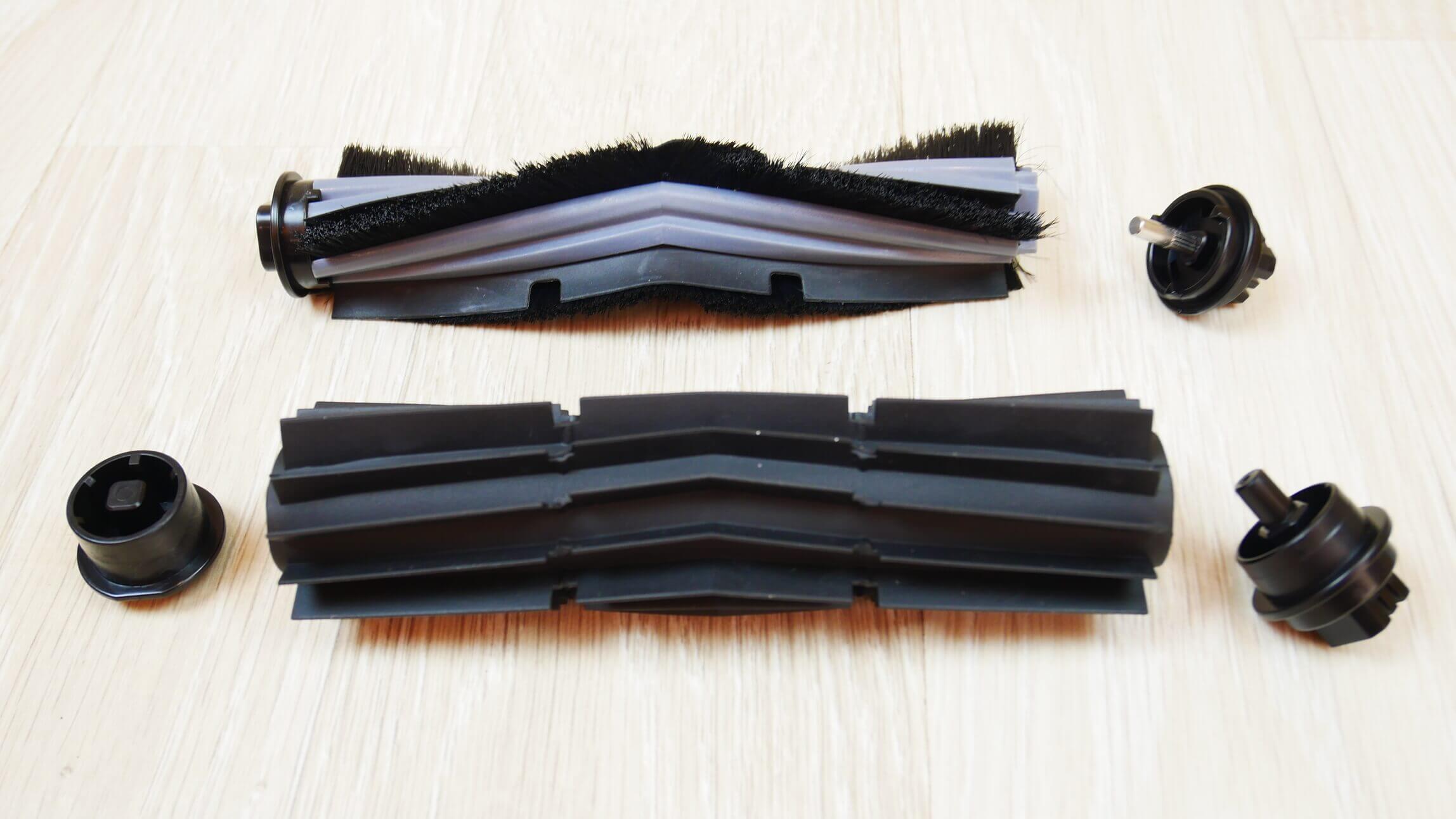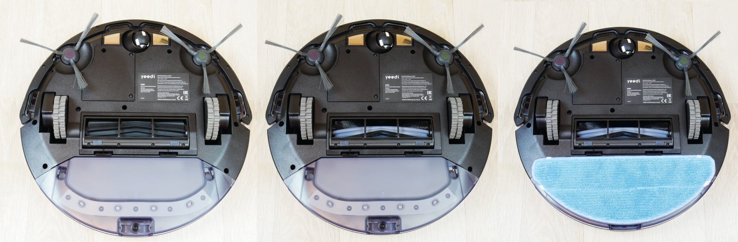 Pažvelkime į roboto apačią. Jis turi du šoninius šepečius, trijų sijų ir greito atleidimo. Tvirtinimo taškai yra spalvotai koduoti. Yra keturi apsaugos nuo kritimo jutikliai. Centrinis šepetys turi apsaugos nuo plaukų susivėlimo sistemą. Robotas standartiškai komplektuojamas su silikoniniu turbo šepečiu, kuris sumažina naminių gyvūnėlių plaukų ir kailio susivėlimo tikimybę. Šepetį galima nuimti iš abiejų pusių, o tai yra privalumas.