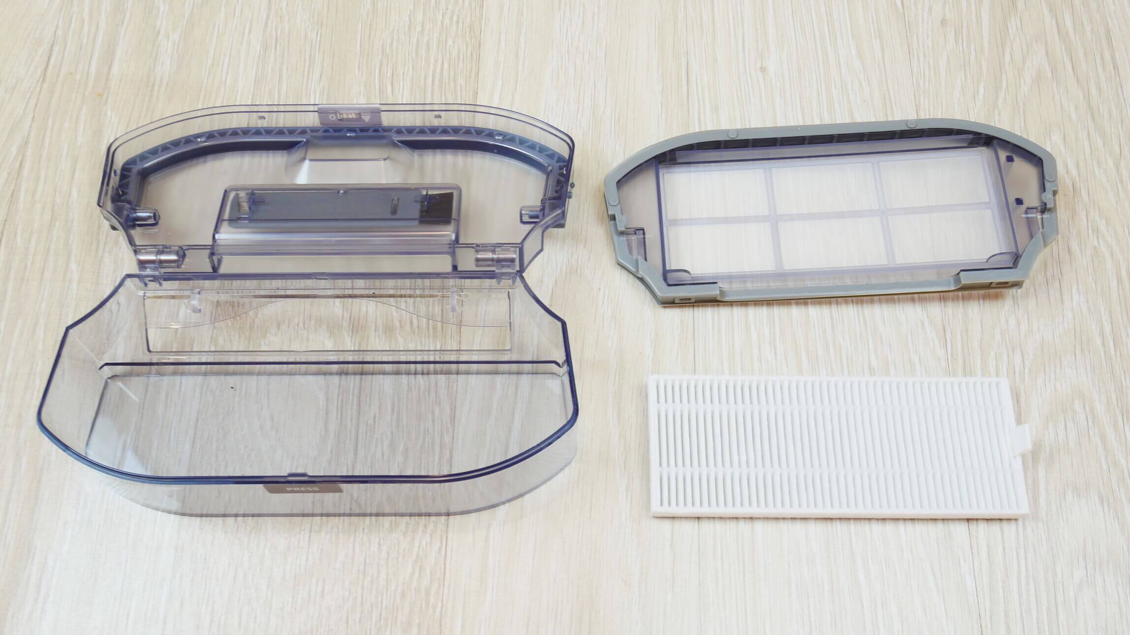 Viršuje matysite pritvirtintą šepetėlį, skirtą centriniam šepetėliui ir dulkių surinktuvui valyti. Konteineris turi sklendę, kad išimant neiškristų šiukšlės. Jame yra triguba filtravimo sistema, kurią sudaro tinklelio, putplasčio ir klostuotas filtras. Gamintojas filtrą nurodo kaip HEPA filtrą.