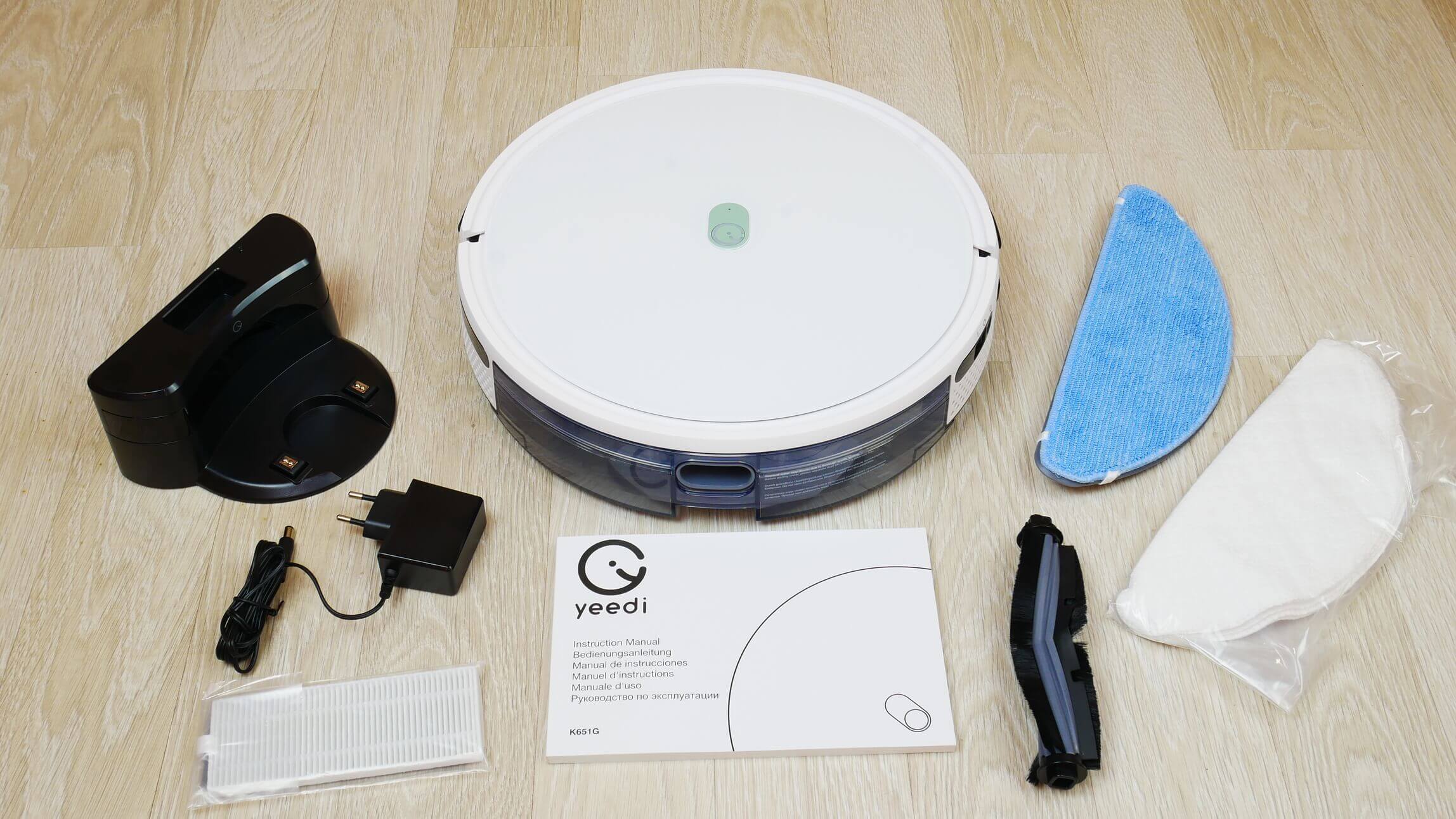 Yra įkrovimo stotelė, bet nėra laido laikymo skyriaus. Pridedamas maitinimo adapteris, skirtas stotelei prijungti prie elektros lizdo. Naudotojo vadovas išverstas į kelias kalbas, įskaitant rusų. Tai didelis pliusas, atsižvelgiant į tai, kad robotas dulkių siurblys pagamintas Kinijoje. Rinkinyje taip pat yra šlapio valymo antgalis su iš anksto sumontuota mikropluošto šluoste, 5 vienkartinių šluosčių rinkinys, pakaitinis centrinis šepetys ir atsarginis filtras.