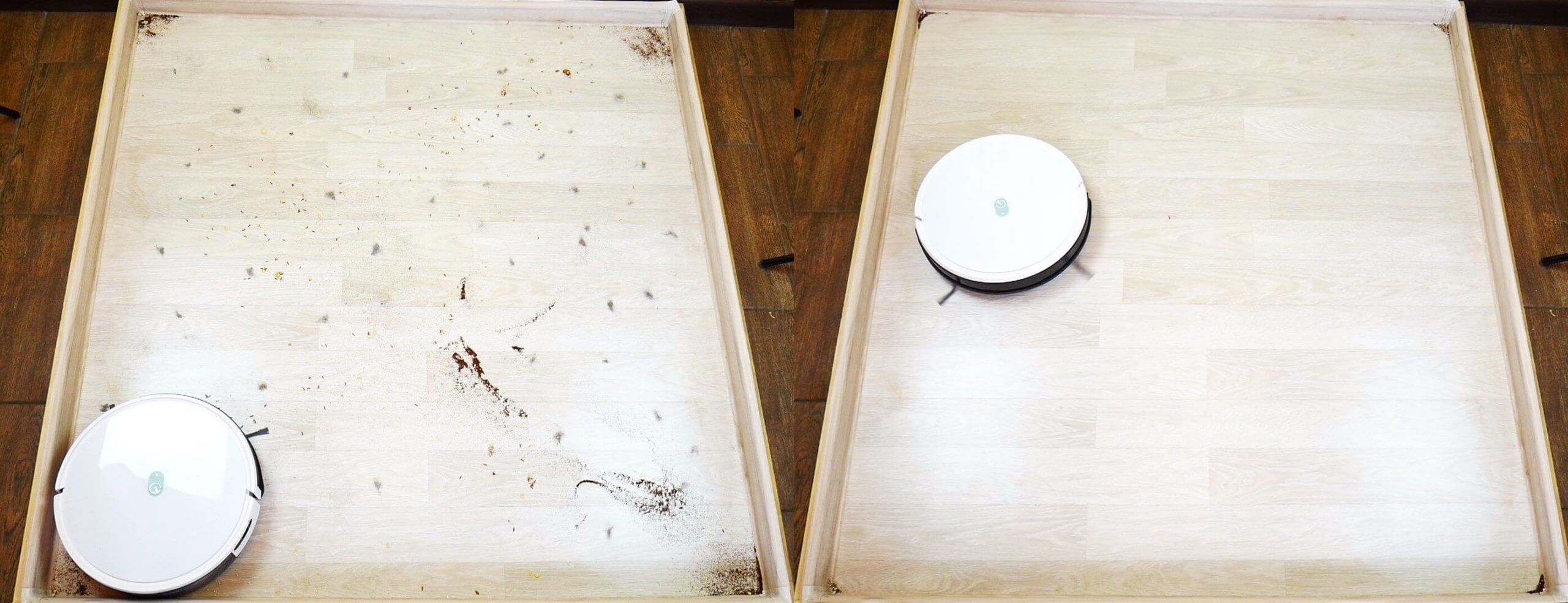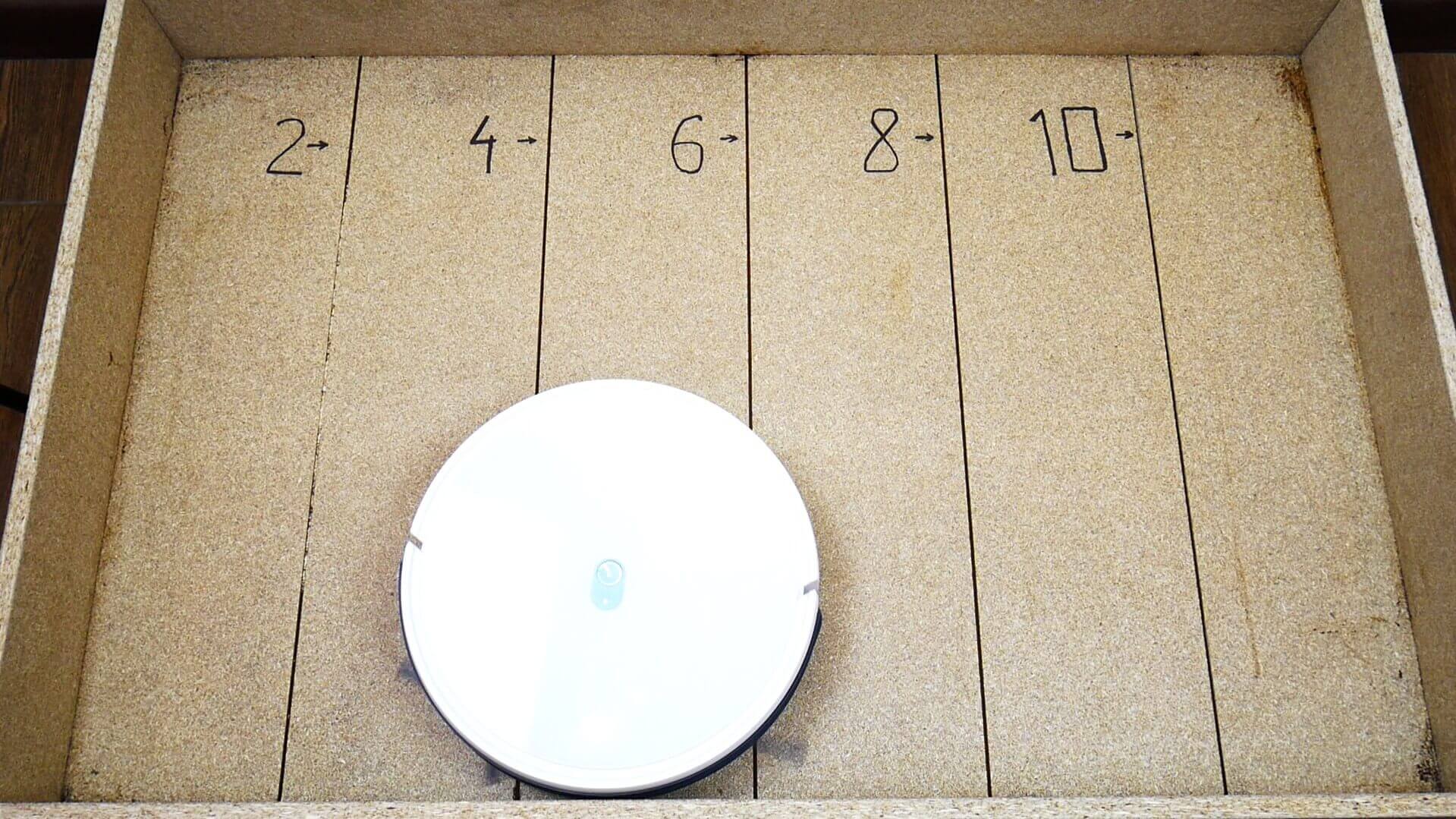 Siurbimo galia robotui dulkių siurbliui su turbo šepečiu yra tinkama. Jis sėkmingai pašalino šiukšles iš 2 mm gylio plyšio.