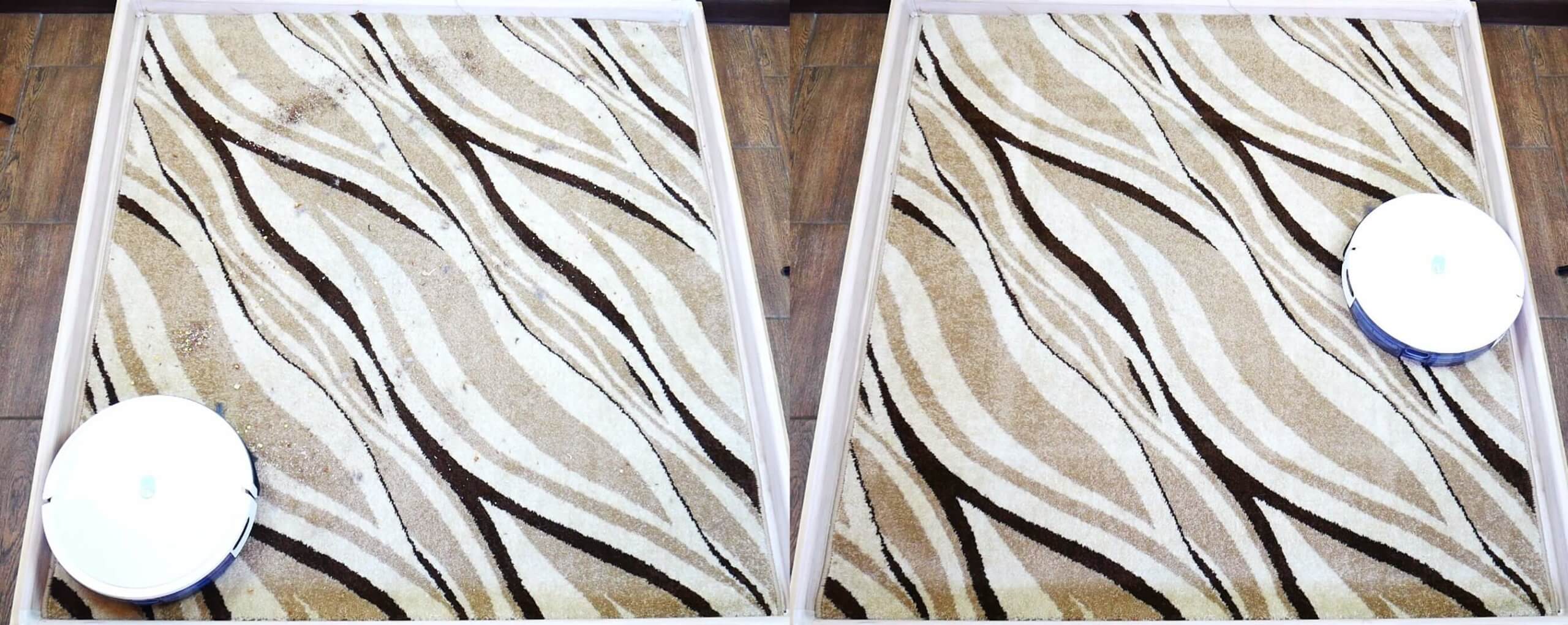 Mes išbarstėme tas pačias šiukšles ant kilimo. Ir, kaip matote, „Yeedi K650“ puikiai išvalė kilimą, nepalikdamas jokių šiukšlių. Kilimų valymo našumas yra puikus.