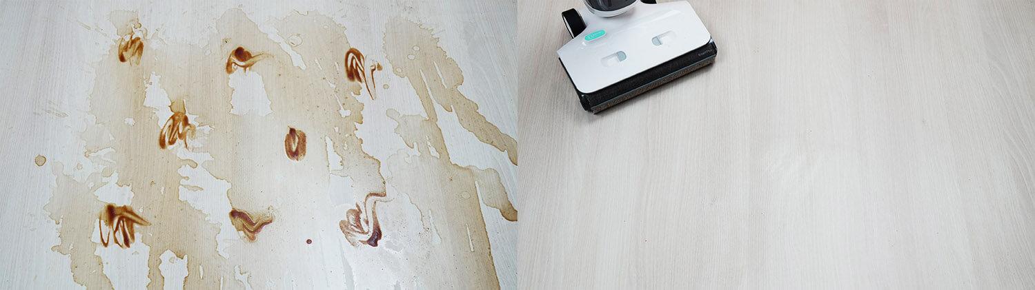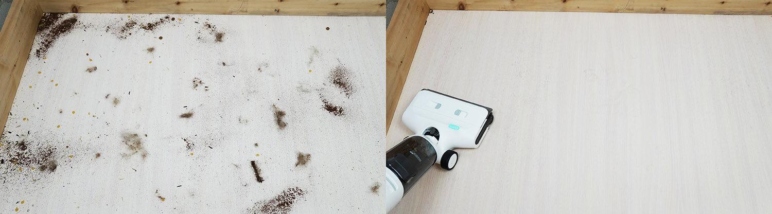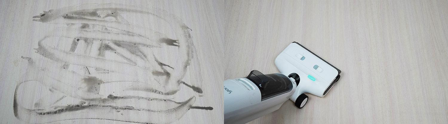 „Yoniev U7s“ taip pat galima naudoti šiek tiek pridžiūvusiems nešvarumams nuo grindų valyti. Kaip matote, neliko jokių žymių ar dryžių. Grindys tampa idealiai švarios.