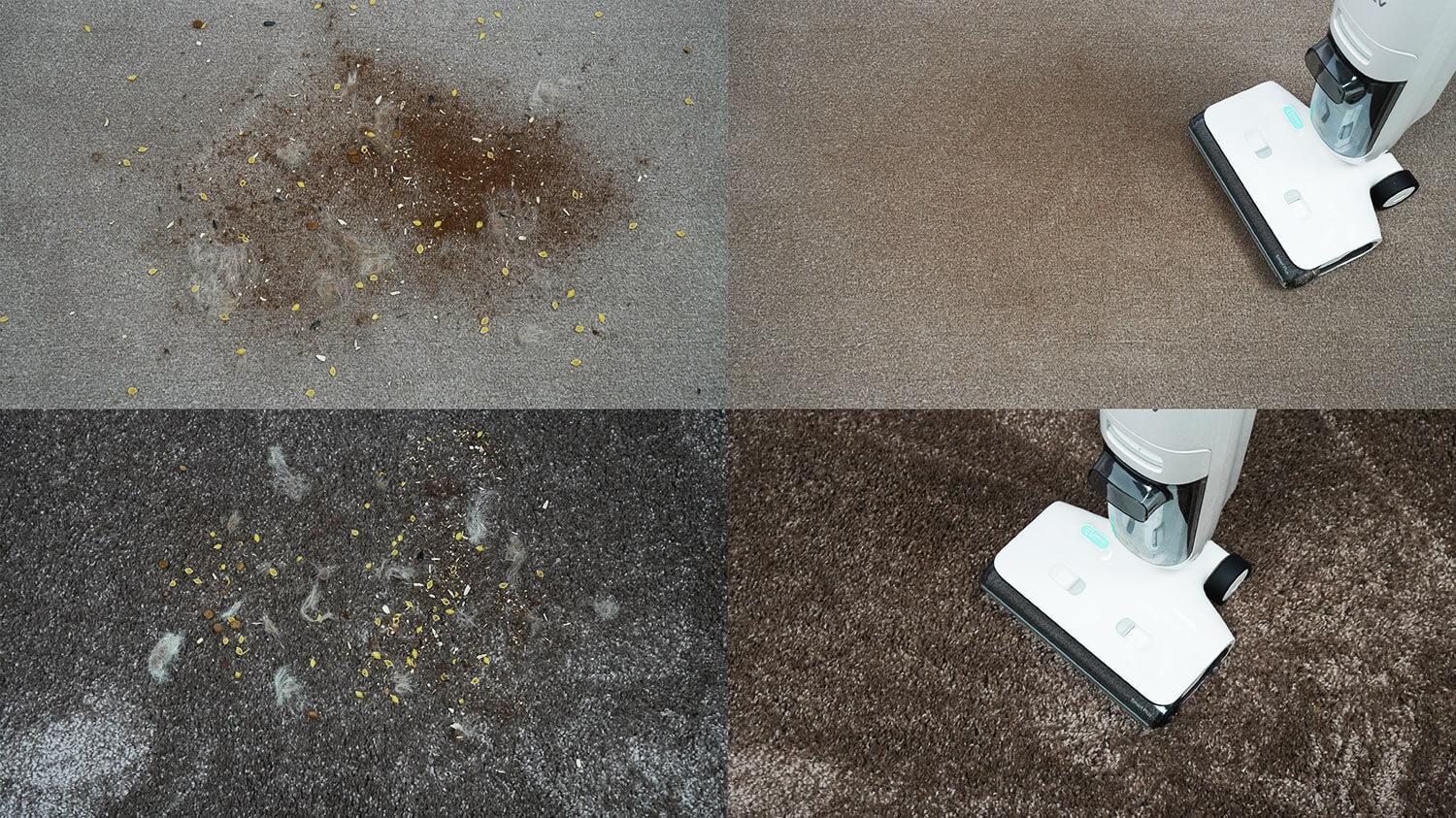 Kadangi tai yra šlapio/sauso valymo dulkių siurblys, jis nepraktiškas kilimams valyti. Tačiau tai vis tiek įmanoma, jei nepilate vandens į baką arba naudojate šlapio valymo režimą, kuris tiesiog susiurbia šiukšles nenaudojant vandens. Nepaisant purios tekstūros, volelis gali surinkti naminių gyvūnėlių plaukus ir kitas šiukšles iš trumpų kilimų.