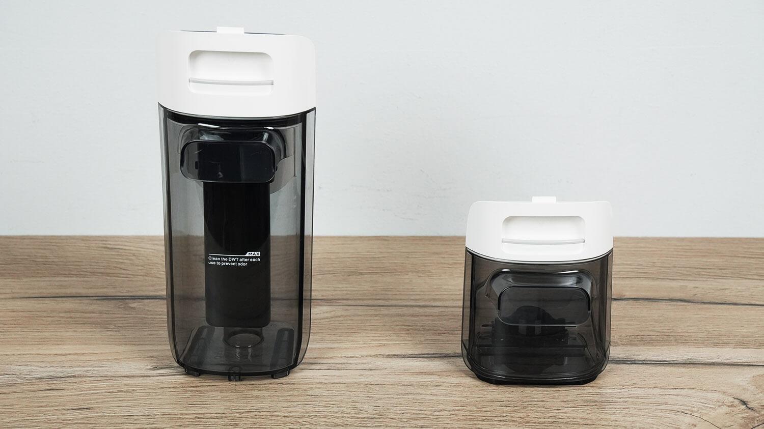 Virš valymo modulio yra vandens bakai. Didesniame bake telpa nešvarus vanduo, o jo talpa – 500 ml.