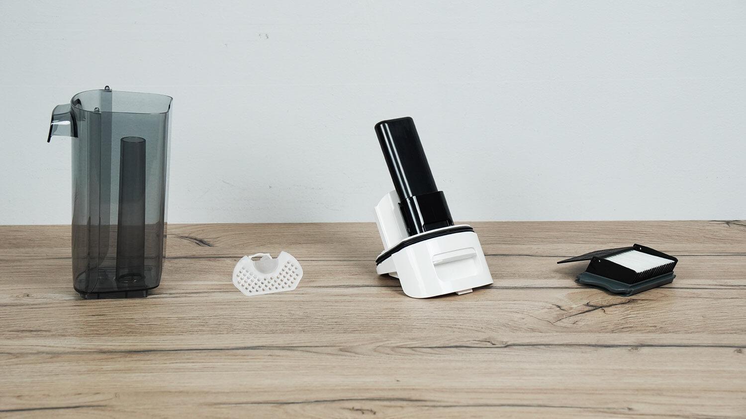 Viduje yra HEPA filtras su tinkleliu, plūdės jutiklis vandens lygiui stebėti ir mažas šiurkštus filtras skysčiui valyti.