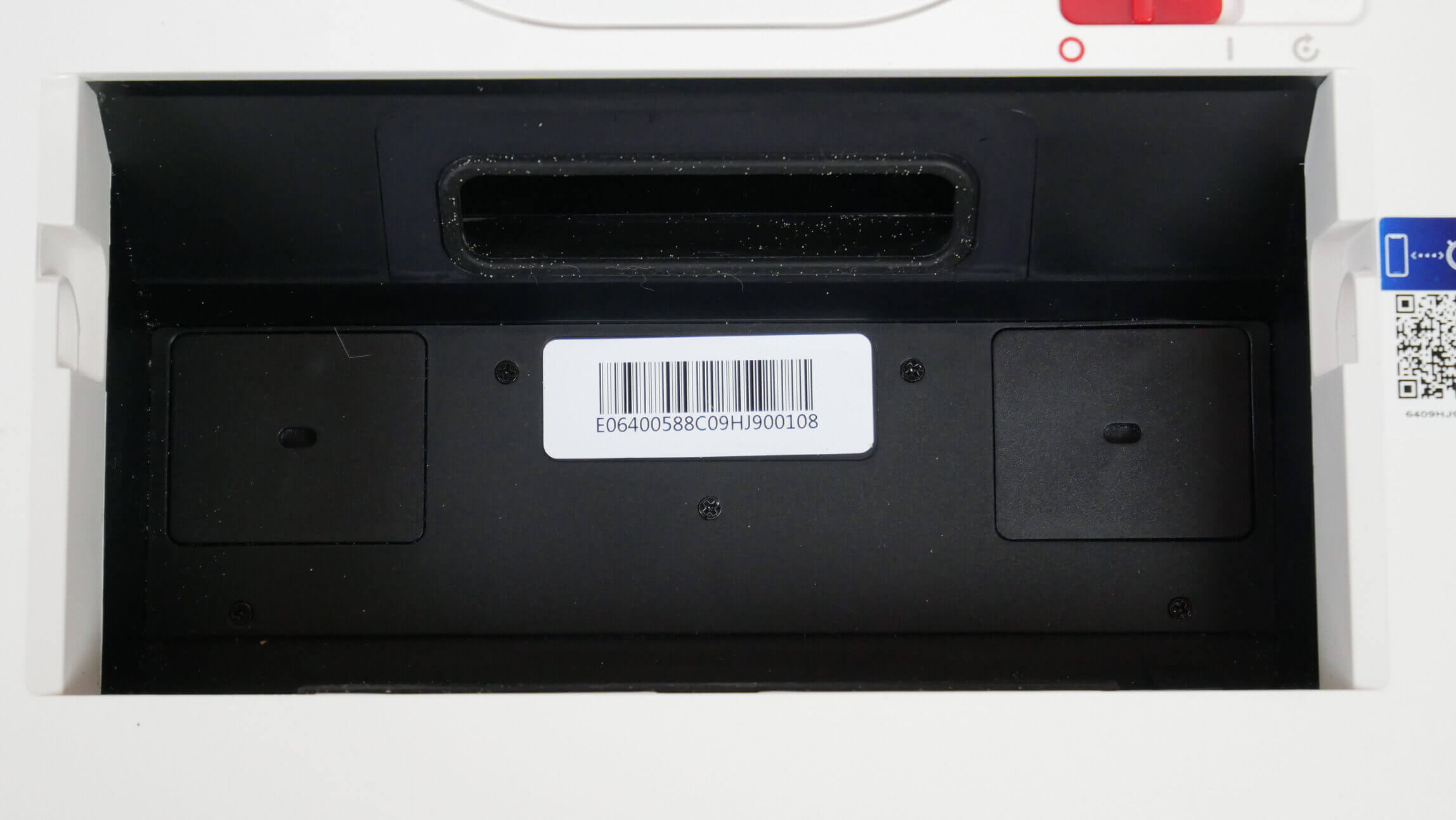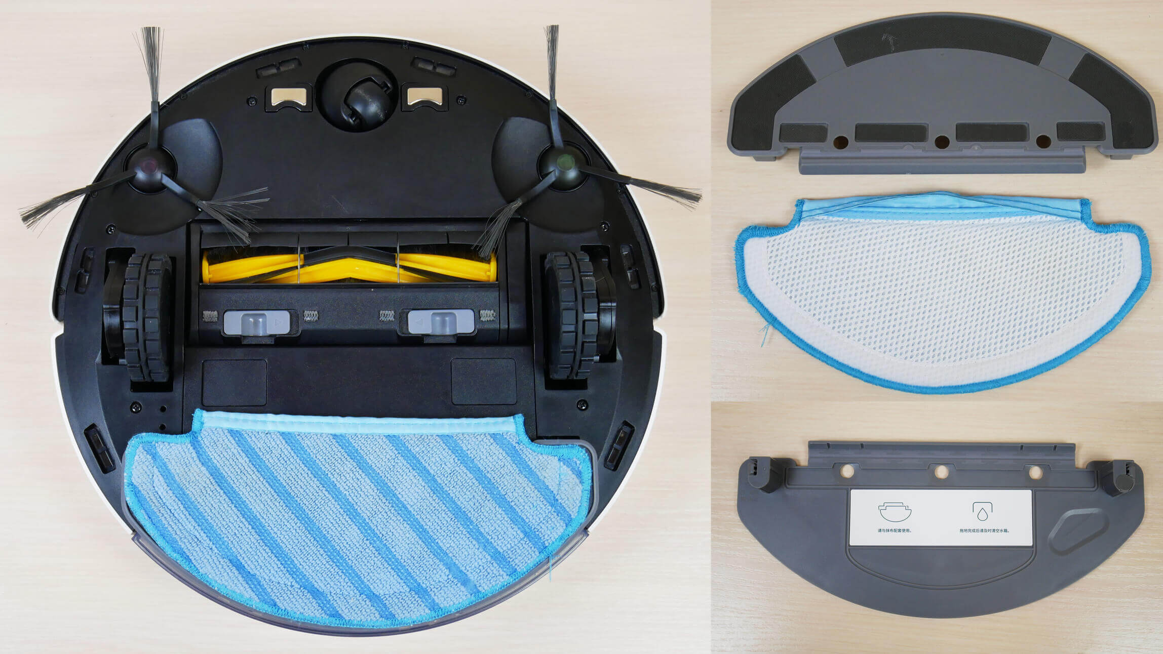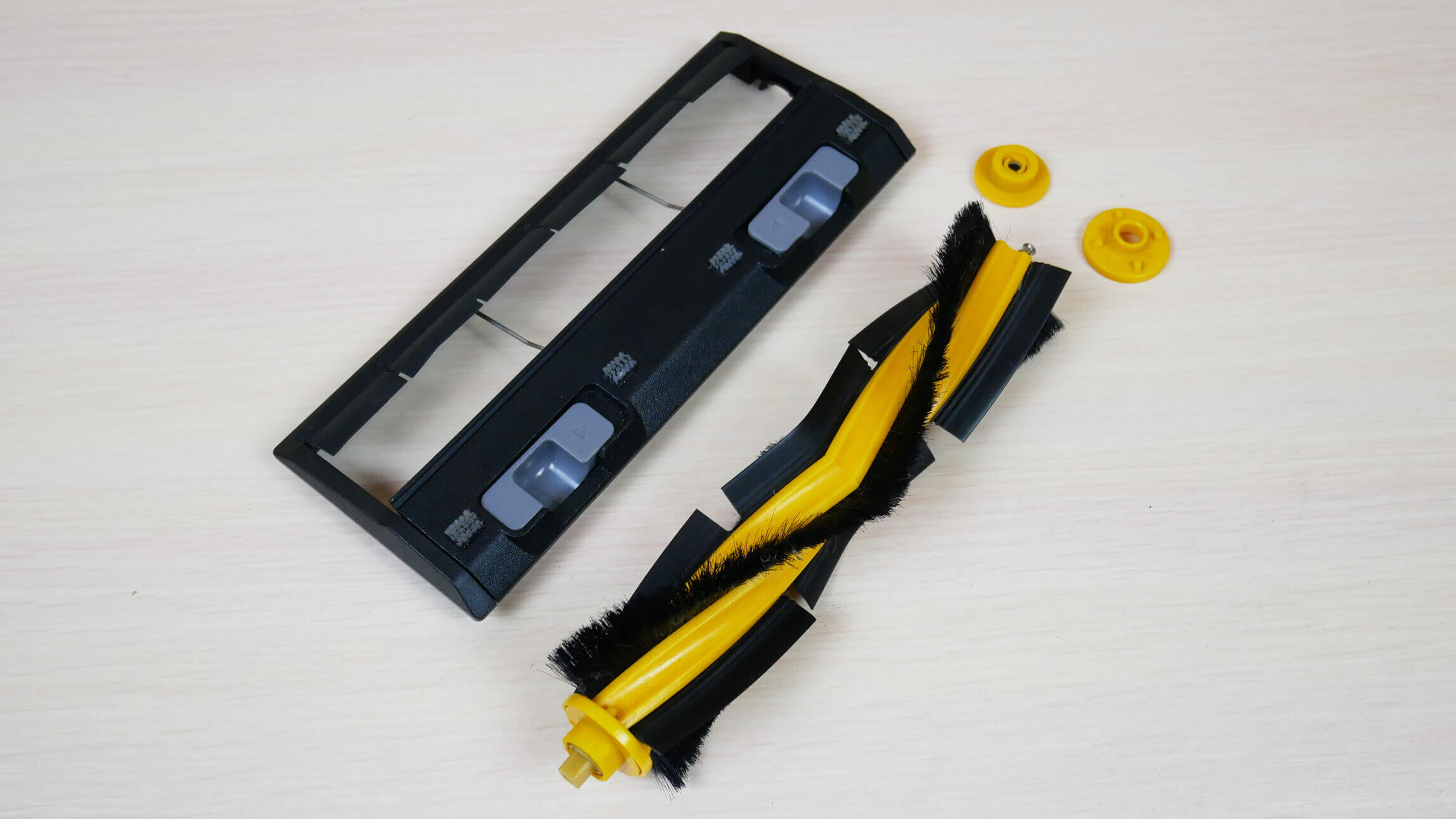 Beje, dar vienas svarbus dalykas: už modulio su centriniu šepečiu matome du kamščius. Jei nuspręsite įsigyti savaiminio valymo stotelę, turėsite juos išimti. Robotas ištuštins dulkių konteinerį per šias angas. Matyt, bazinis įrenginys taip pat turėtų būti su specialia dulkių konteineriu su dulkių šalinimo sklendėmis.