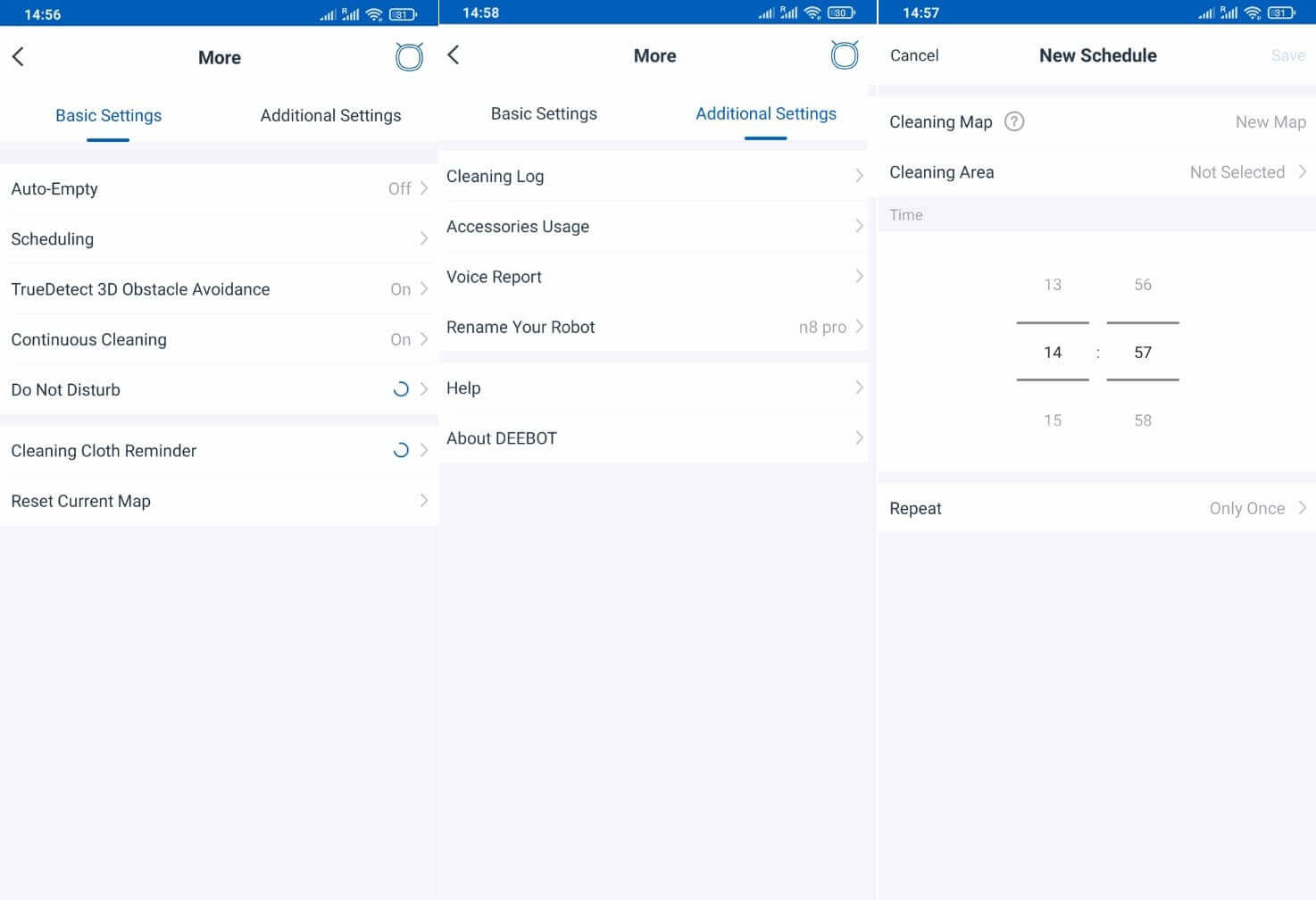 Papildomuose nustatymuose galite peržiūrėti valymo žurnalą, sekti eksploatacinių medžiagų būseną, reguliuoti garsumą ir pasirinkti balso pranešimų kalbą. Šis robotas dulkių siurblys gali kalbėti anglų ir kinų kalbomis.