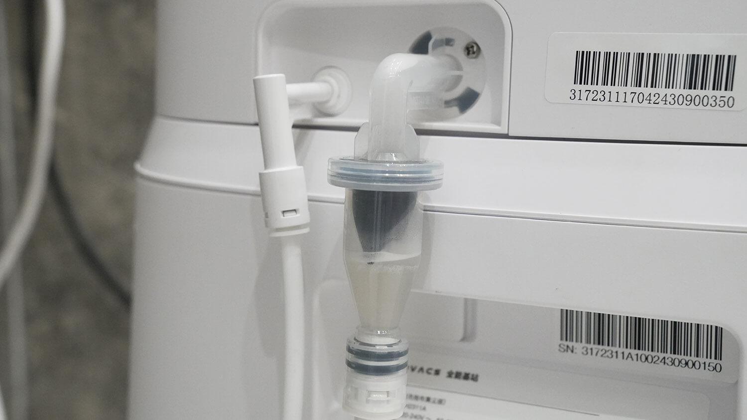 Robotas taip pat turi nedidelį 55 ml vandens bakelį, paslėptą korpuso viduje. Vanduo automatiškai pumpuojamas į bakelį stotelėje ir valymo metu išpilamas ant valymo pagalvėlių.