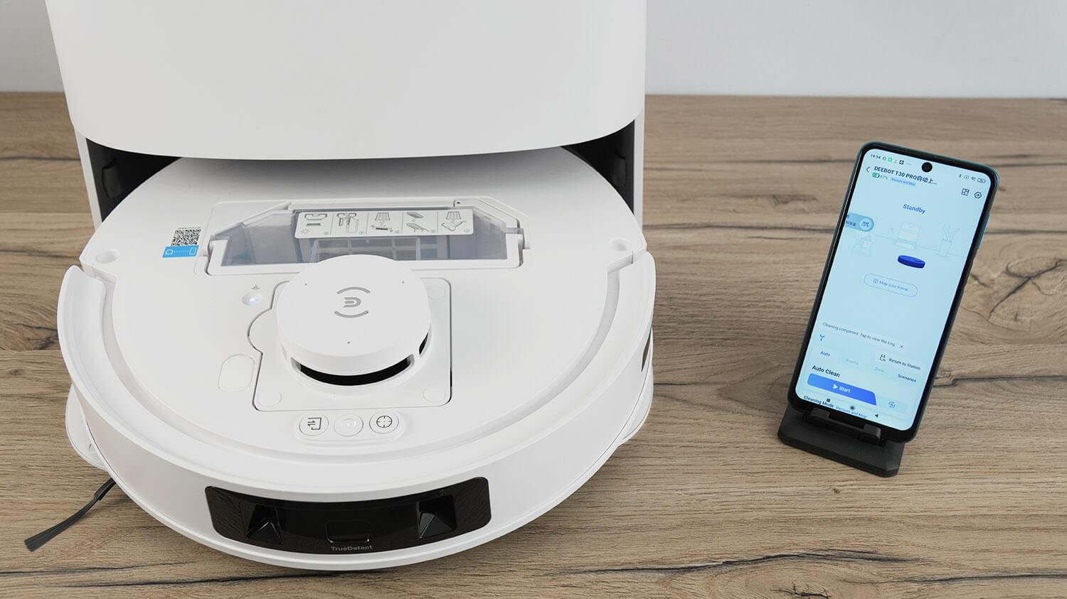 Kalbant apie stotelę, „Ecovacs Deebot T30 Pro“ pats išsivalo nuo šiukšlių, servetėles nuplauna iki 70 laipsnių pašildytu vandeniu ir po valymo servetėles išdžiovina šiltu oru.