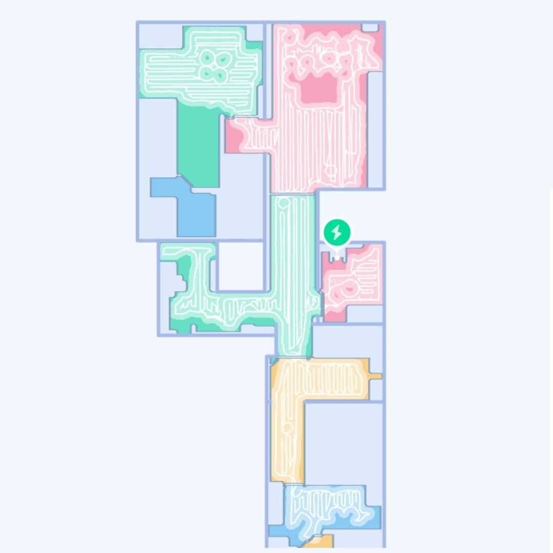 Kalbant apie navigaciją namuose, robotas dulkių siurblys valo kambarį po kambario, sekdamas perimetrą, o tada juda vingiuotu keliu. Kas 15 minučių, kaip jau minėjau, jis grįžta į stotelę ir išplauna šluostes, o tada tęsia valymą nuo ten, kur baigė. Iš viso per valymo ciklą jis tris kartus nuvyko į stotelę, kad išplautų šluostes. Nebuvo jokių neišvalytų vietų; šis modelis turi puikią navigaciją!
