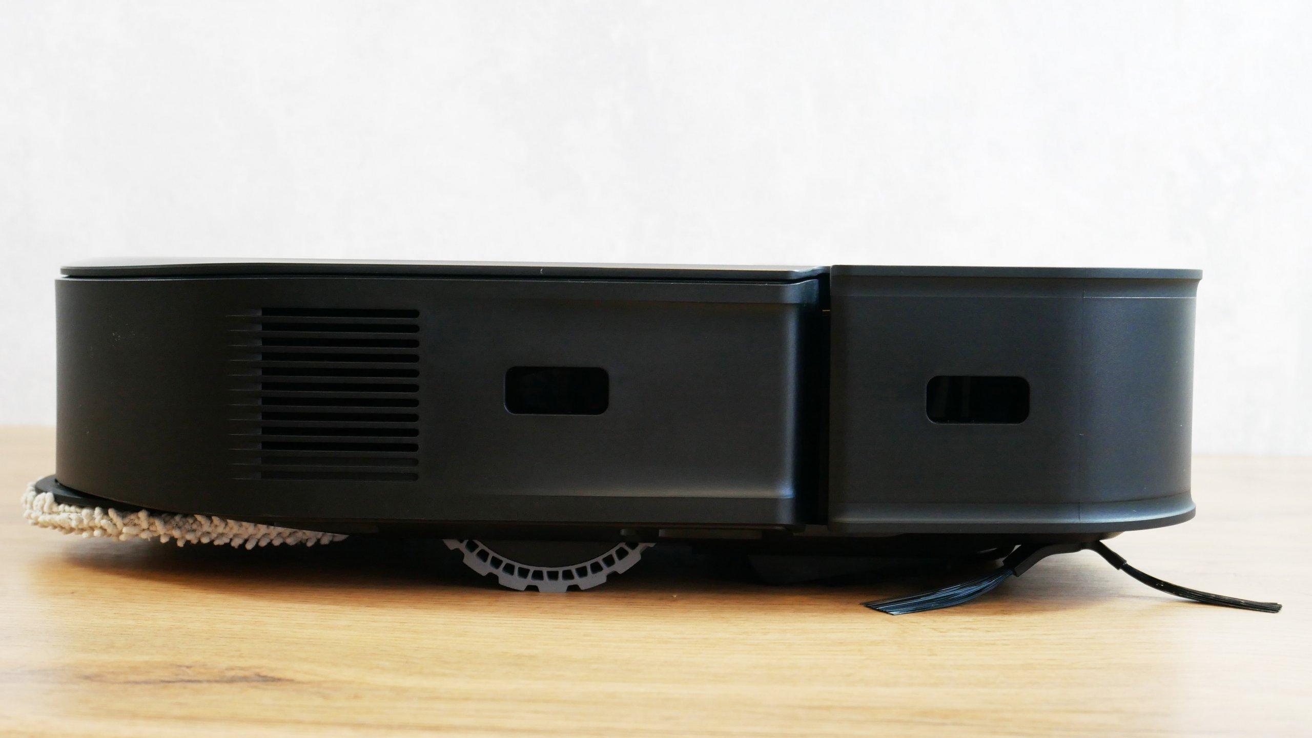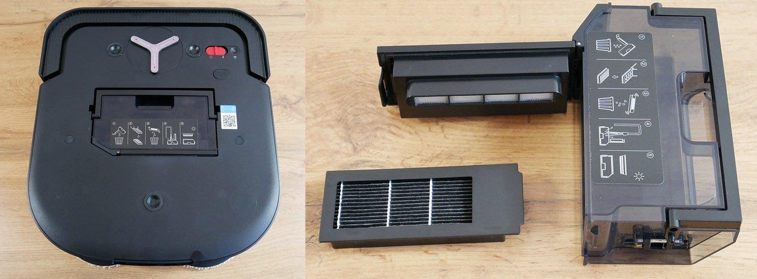 Viršutinis dangtelis yra nuimamas ir laikomas magnetais. Po juo yra maitinimo jungiklis, „Wi-Fi“ atstatymo mygtukas ir dulkių surinktuvas. Dulkių surinktuve yra triguba filtravimo sistema: HEPA, putplasčio ir tinklelio filtrai. Konteineris talpina iki 420 ml sausų atliekų. Šone yra savaiminio išsivalymo užuolaida. Vandens bakas yra roboto viduje. Jis yra nenuimamas ir talpina iki 180 ml vandens, kuris automatiškai pumpuojamas į stotelę per specialų antgalį.