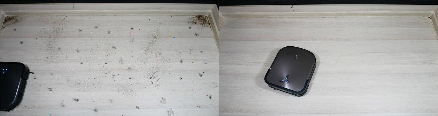 Tačiau įvairios tekstūros šiukšlių surinkimo nuo laminuotų grindų kokybė yra gera. Robotas dulkių siurblys gali sušluoti šiukšles net kampuose, nors ne visada. Pirmojo bandymo metu su šerelių-žiedlapių šepečiu jis iššlavė vieną kampą, bet ne kitą. Turbo šepetys taip pat surinko kailį ir plaukus.