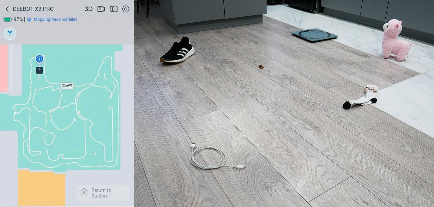 Galiausiai galiu pasakyti, kad robotas kruopščiai valo ir sušluoja daugumą daiktų, ir netgi atrodo, kad sistema tapo tikslesnė, kaip teigė gamintojas. Taigi, šią funkciją tiesiog reikia toliau tobulinti. Taip pat reikėtų atkreipti dėmesį, kad „Ecovacs Deebot X2 Pro“ aptinka objektus, bet jų neatpažįsta. Jis nerodo atpažintų objektų piktogramų žemėlapyje, kitaip nei „Roborococ“ ir „Dreame“. Todėl dirbtinio intelekto buvimas yra abejotinas.