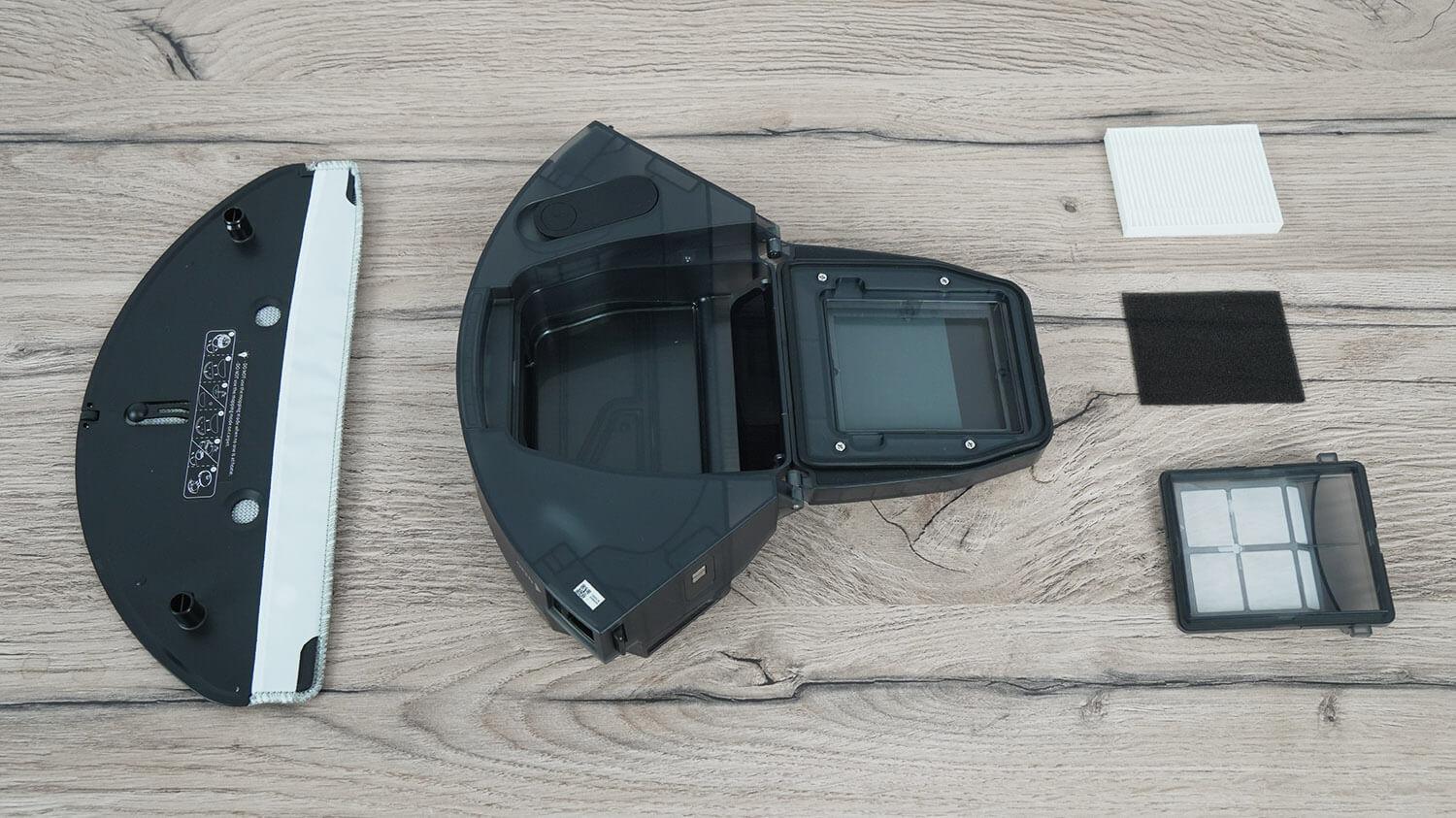 Kombinuotą vandens ir atliekų konteinerį galima nuimti iš galo. Dulkių konteinerio talpa yra 260 ml. Filtravimo sistemą sudaro HEPA filtras, putplastis ir tinklelis. Vandens bako talpa – 290 ml. Viduje įrengtas elektroniniu būdu valdomas siurblys. Bako apačioje pritvirtintas valymo šluostės laikiklis, tvirtinamas lipnia juosta ir kišene.
