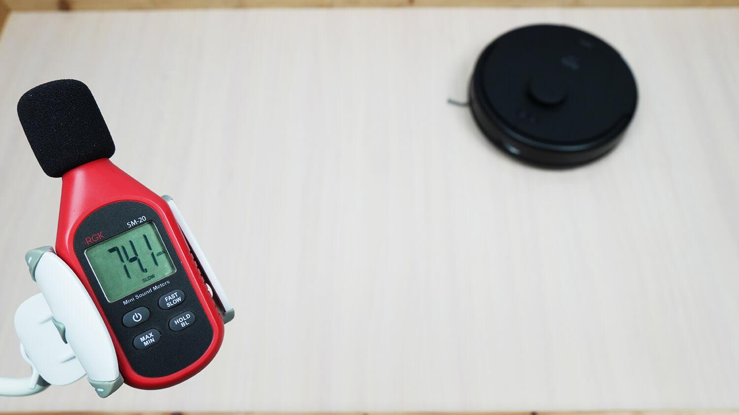 Galiausiai išmatavome „eufy L60“ triukšmo lygį. Jis svyravo nuo 67,6 iki 75 dB. Tai yra daugiau nei panašių įrenginių, ir į tai svarbu atsižvelgti. Stotis taip pat yra triukšminga, jos didžiausias triukšmo lygis siekia 79 dB.
