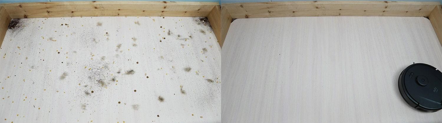 Laminuotų grindų valymo rezultatai buvo geri – pašalintos beveik visos šiukšlės, išskyrus nedidelius likučius kampuose, kuriuos sunku pasiekti apvaliems robotams. Centrinis šepetys surinko šiek tiek naminių gyvūnėlių plaukų ir kailio, ko ir buvo galima tikėtis.