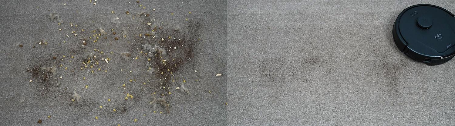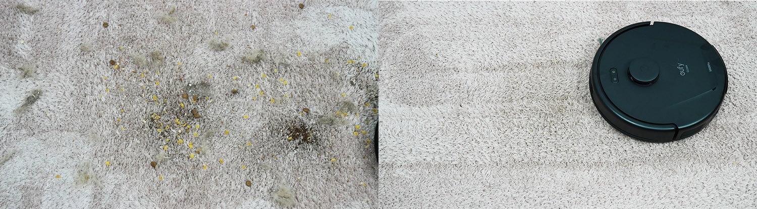 Tos pačios šiukšlės buvo išbarstytos ant trumpo plauko kilimo. Ir galiu pasakyti, kad „eufy L60“ kilimą išvalė gerai. Ant vidutinio plauko kilimo buvo prilipusių šiukšlių, bet nieko reikšmingo. Tai greičiausiai dėl neplaukiojančio centrinio šepečio mazgo.