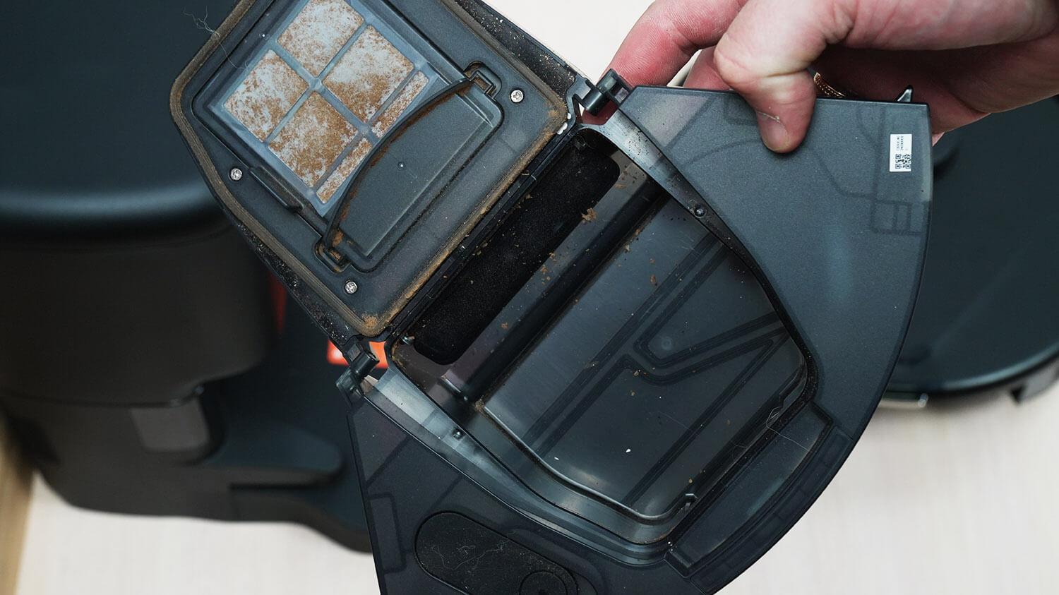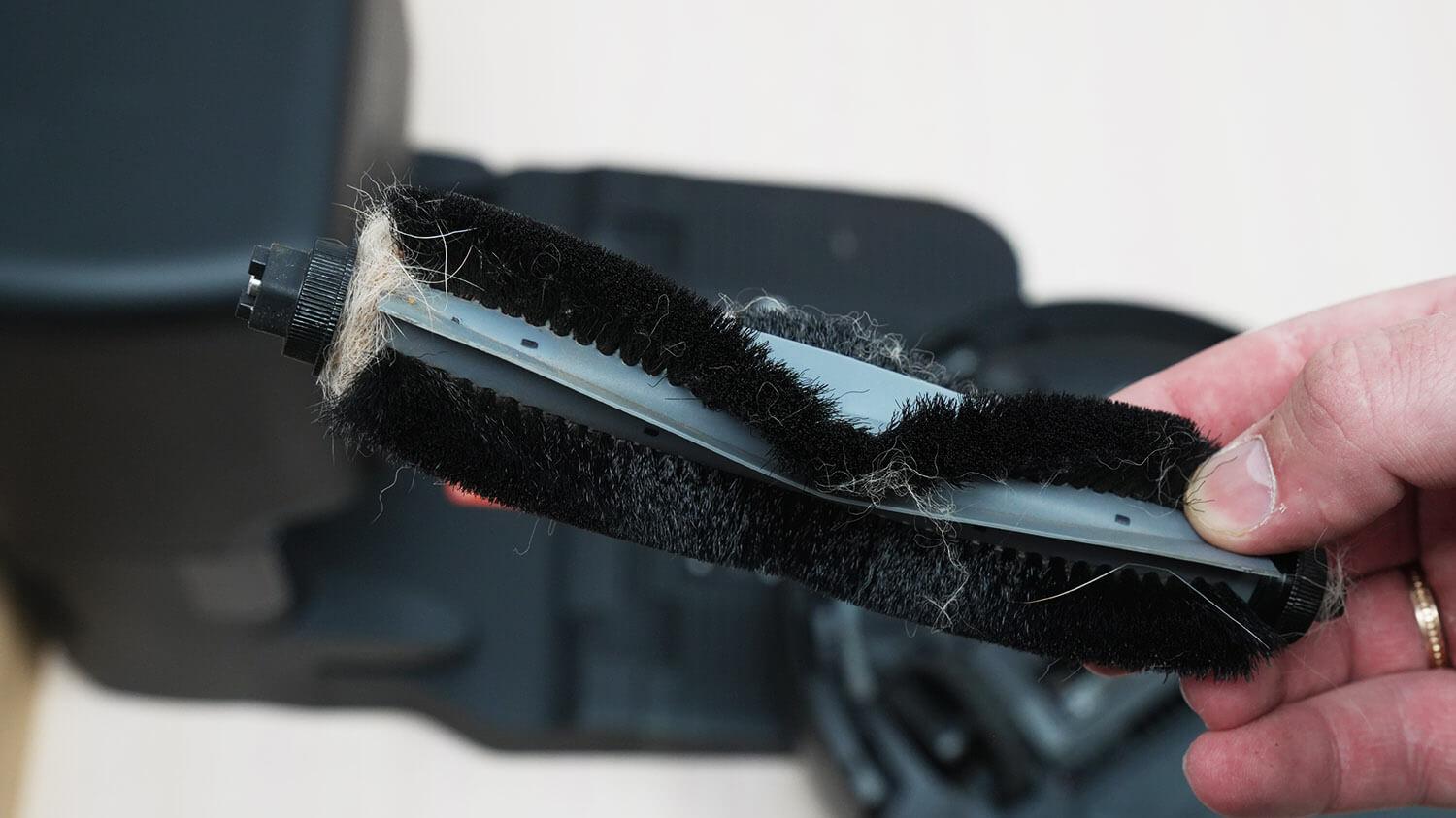 Iškart po „nešvarumų testų“ patikrinau, kaip gerai roboto dulkių siurblio stotelė savaime išsivalo dulkių konteinerį ir turbošepetį. Dulkių konteineris buvo pilnas, o aplink šepetį buvo apsivėlę plaukai ir kailis. Grąžinau robotą į stotelę ir pradėjau savaiminį valymą. Rezultatai buvo geri. Dulkių konteineris buvo tuščias, o turbošepetys taip pat švarus.