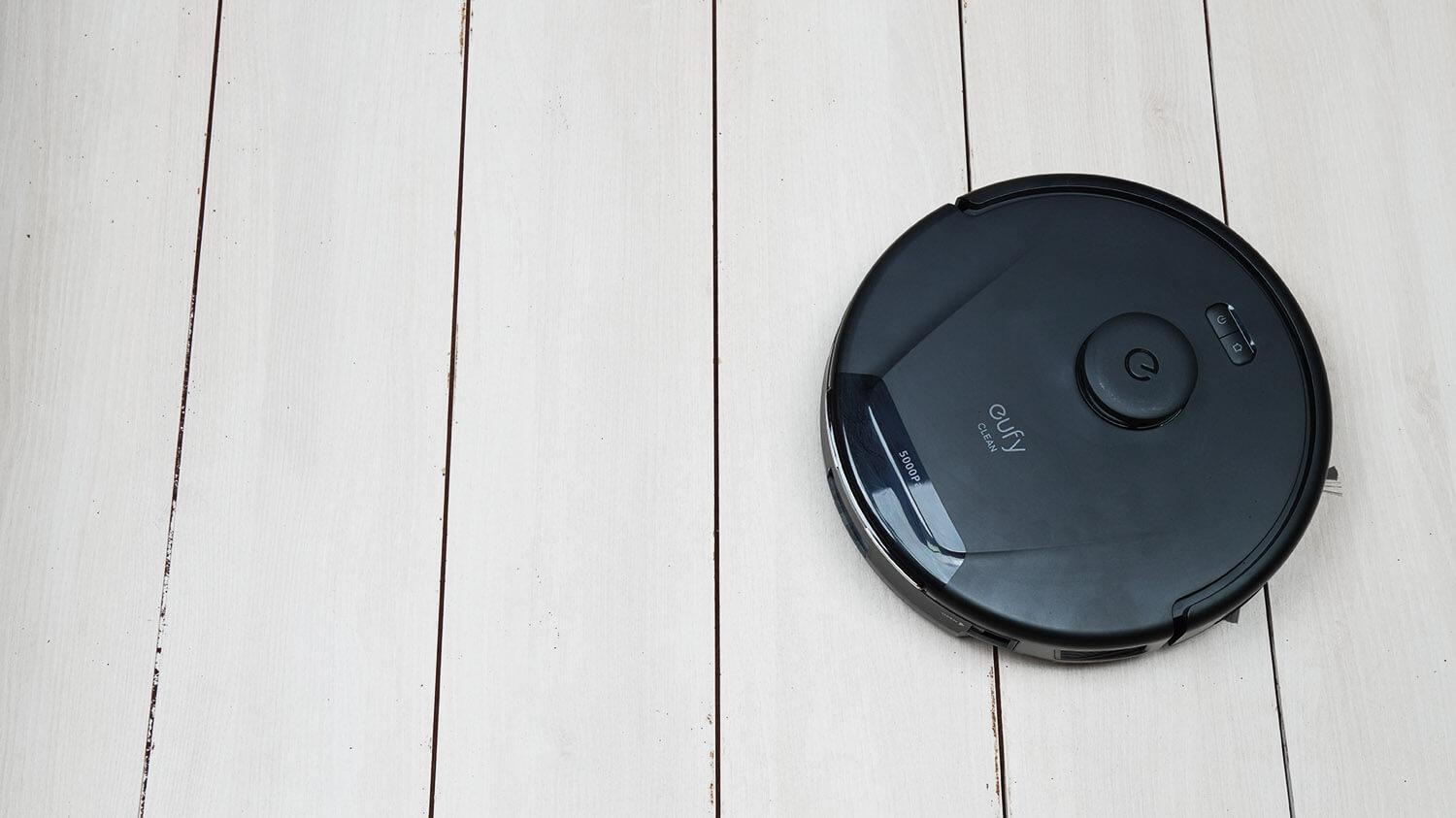 Dar vienas pliusas yra tas, kad „eufy L60“ nebijo juodų paviršių ir laisvai juda per juos.