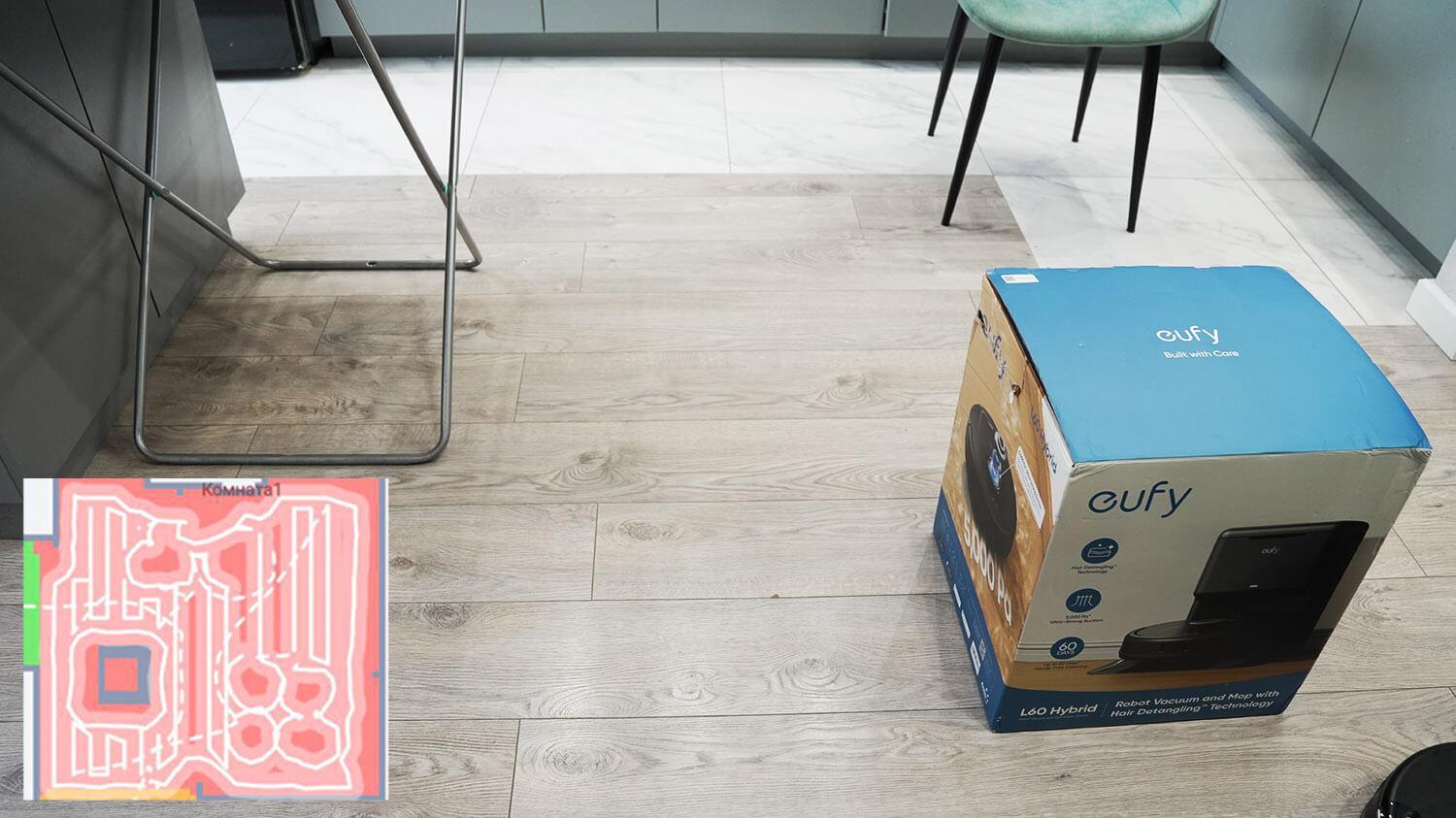 Galiausiai pereikime prie bandymų. Pirmiausia išbandysime „eufy L60“ navigaciją kambaryje su kliūtimis. Pirmiausia robotas dulkių siurblys naršo kambario perimetru. Jis apeina džiovyklės kojeles neužstrigdamas. Tada jis atskirai apvalo dėžę ir toliau valo visą prieinamą plotą gyvatės būdu. Jis atskirai apvalo kiekvieną kėdės koją ir grįžo į stotelę. Bandymas buvo sėkmingas.