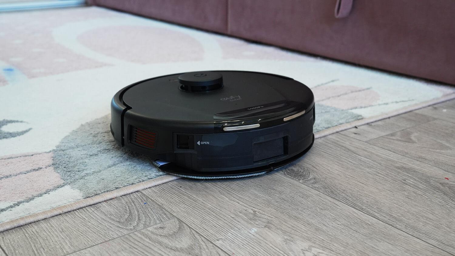 Kalbant apie navigaciją namuose, robotas dulkių siurblys valo kambarį po kambario, sekdamas perimetrą, o tada juda vingiuotu keliu. Pastebėjau, kad „eufy L60“ kas 15 minučių grįždavo į savo įkrovimo stotelę, kad išsivalytų dulkių surinktuvą ir šepetį. Nebuvo jokių neišvalytų vietų, o šis modelis pasižymi puikia navigacija.