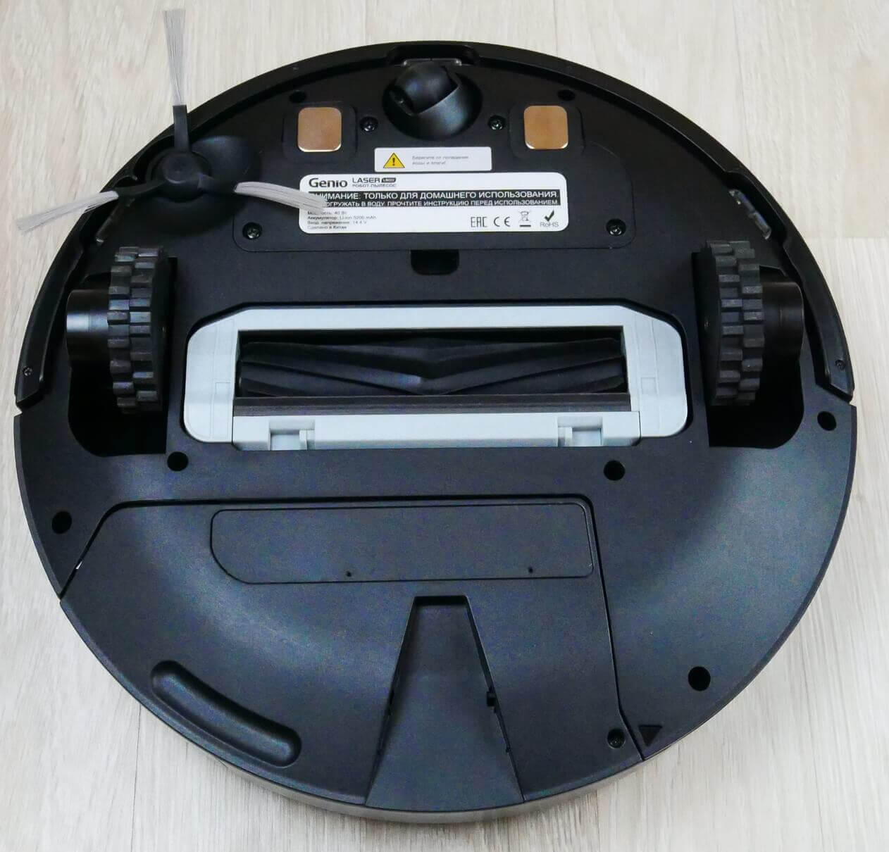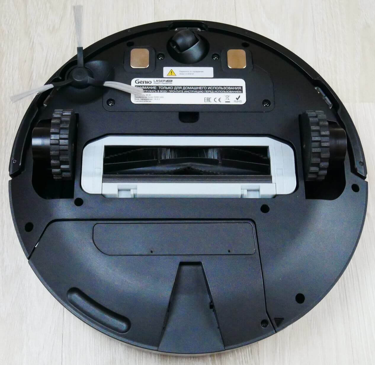 Pažvelkime į roboto struktūrą iš apačios. Matome, kad yra vienas šoninis šepetys, trijų šakų, šeriuotas. Centrinis šepetys yra nenuimamas, šeriuotas žiedlapių formos šepetys. Nuimamas tik vienas dangtelis.