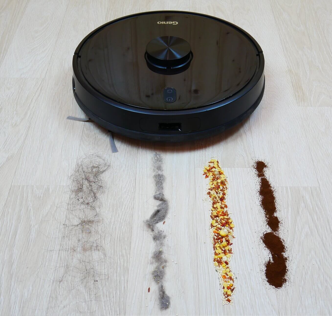 Dabar pažiūrėkime, kaip gerai „Genio Laser L800“ surenka įvairias šiukšles nuo laminuotų grindų. Mūsų atveju tai buvo naminių gyvūnėlių plaukai, įvairūs grūdai ir malta kava kaip dulkių imitacija.